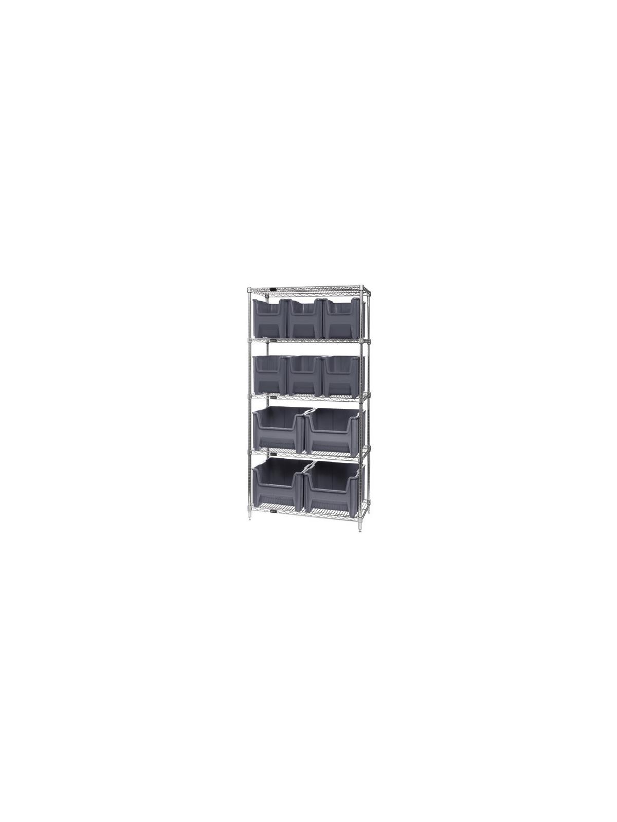 Combine stylish chrome shelving and parts organizing bins. Sturdy shelving unit supports loads up to 800 lbs. Choice of bins. Easy to assemble. Giant Hopper Bins are available in Gray, Blue, or Red. FOB Shipping Point.