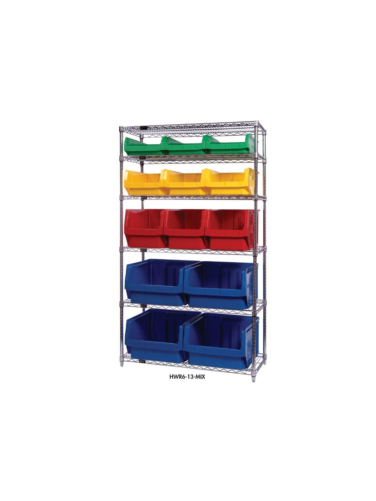 Combine stylish chrome shelving and parts organizing bins. Sturdy shelving unit supports loads up to 800 lbs. Choice of bins. Easy to assemble. Magnum Bins are available in Blue, Yellow, Green, Red, or Black. FOB Shipping Point.