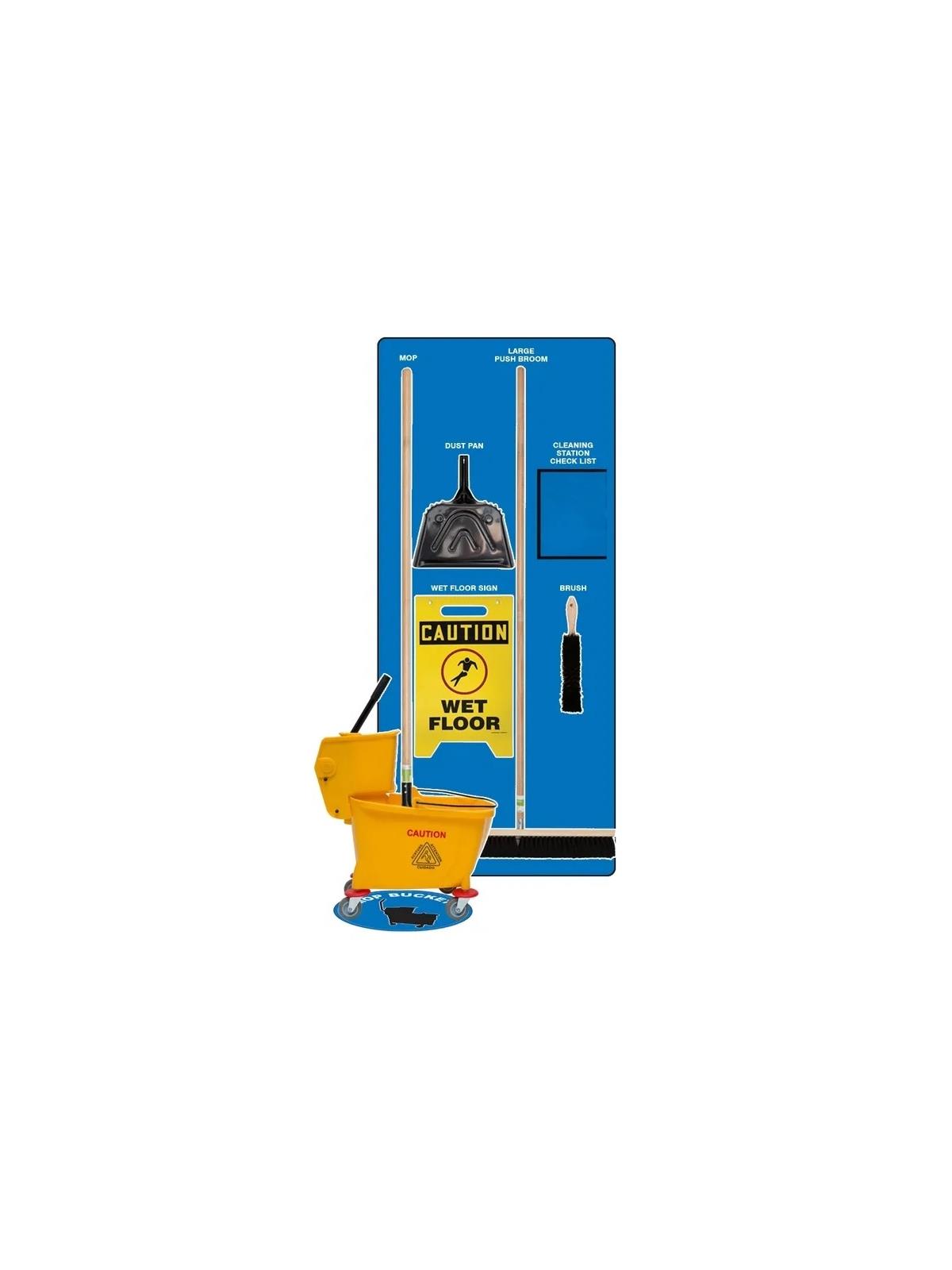 If combo is chosen, kit comes with: 24" Push broom head, 8" Bench Brush, 60" Wood handle, Metal Dust pan, 60" Wood mop handle, Cotton Mop Head, 35 QT Yellow Mop Bucket w/Ringer, "Caution Wet Floor" Fold Up Sign, 17" Matching Round Floor sign for the mop bucket.