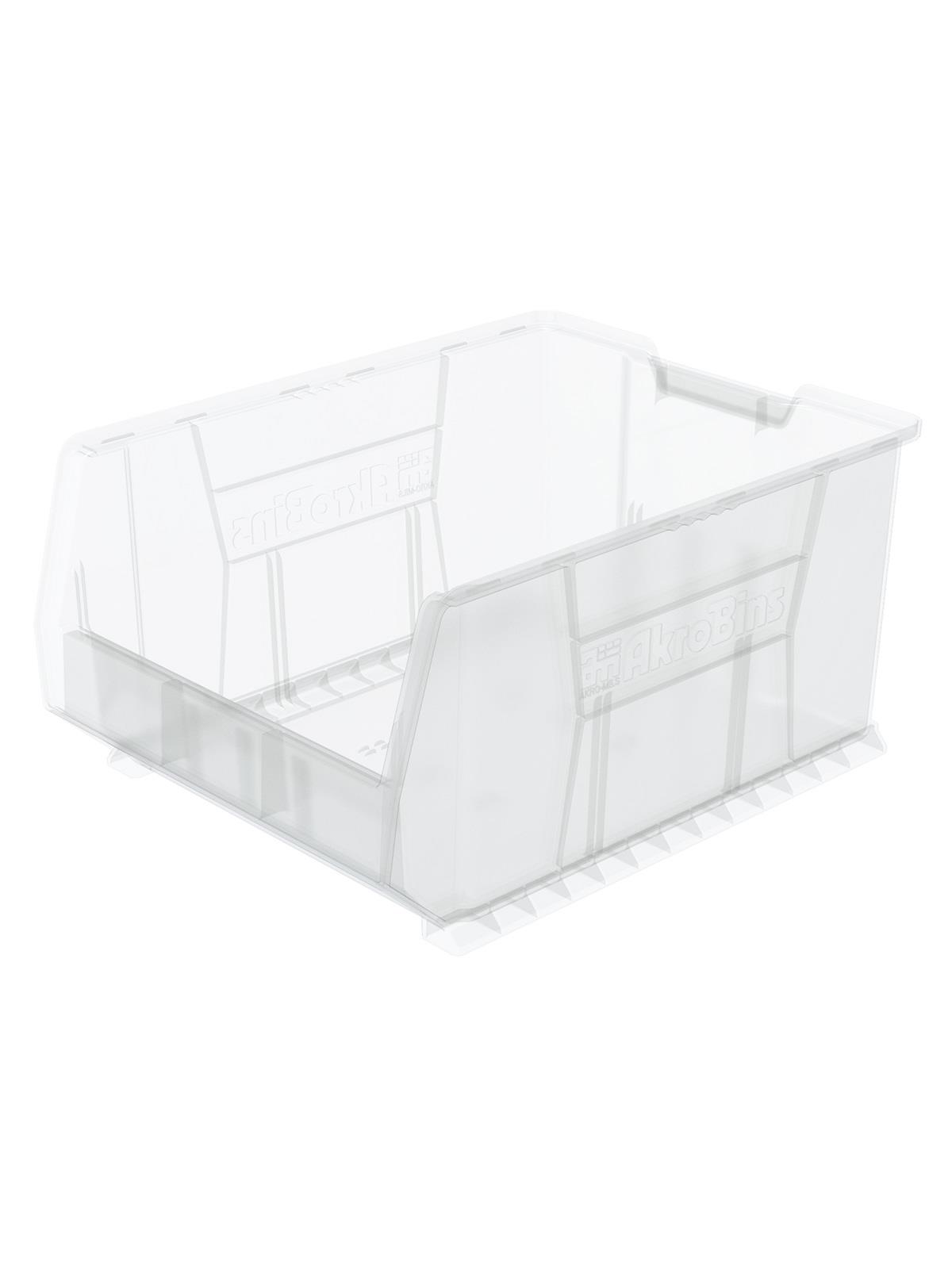 20", 24" and 30" Deep Clear Bins for Super-Size Storage. Large capacity storage bins for organizing heavy or bulky items. Heavy-duty bins molded in clear polypropylene. Extra large stacking containers feature anti-slide stop to prevent bins from shifting forward. Reinforced side ribs add strength and prevent spreading when stacked or loaded. Optional lids and dividers available. FOB Shipping Point.