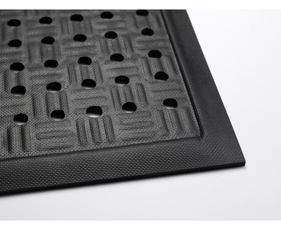 These anti-fatigue mats feature nitrile foam designed to withstand grease, oil, and chemicals. They are anti-microbially treated to prevent odors and have drainage holes for use in wet areas. FOB Shipping Point.