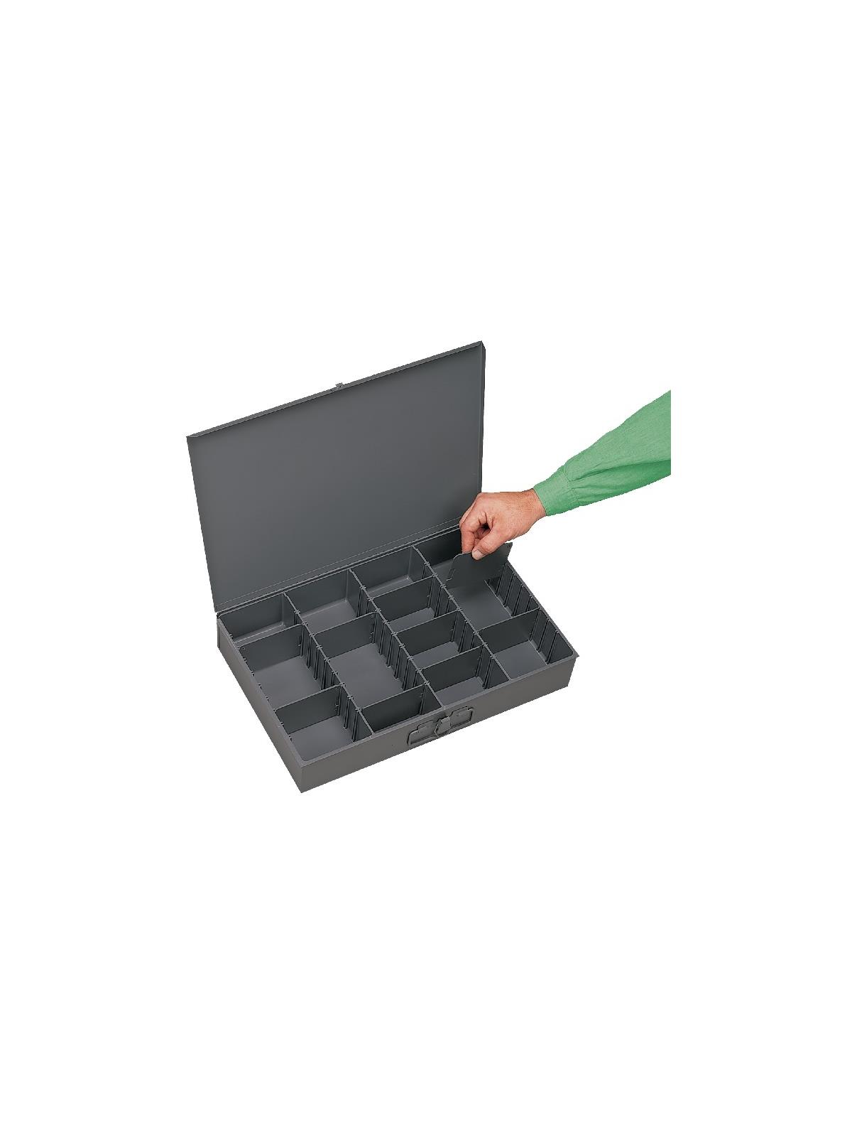 Efficient storage and organization for a variety of parts and components. Each compartment box interior is manufactured of polypropylene with scooped bottoms, both front and back for easy parts removal. Rugged steel, all-welded cabinets are reinforced for rigidity. Use on the workbench, counter or carry to the job site with convenient thumb-grip handles. Finished in acid and rust resistant Gray powder coating. FOB Shipping Point.