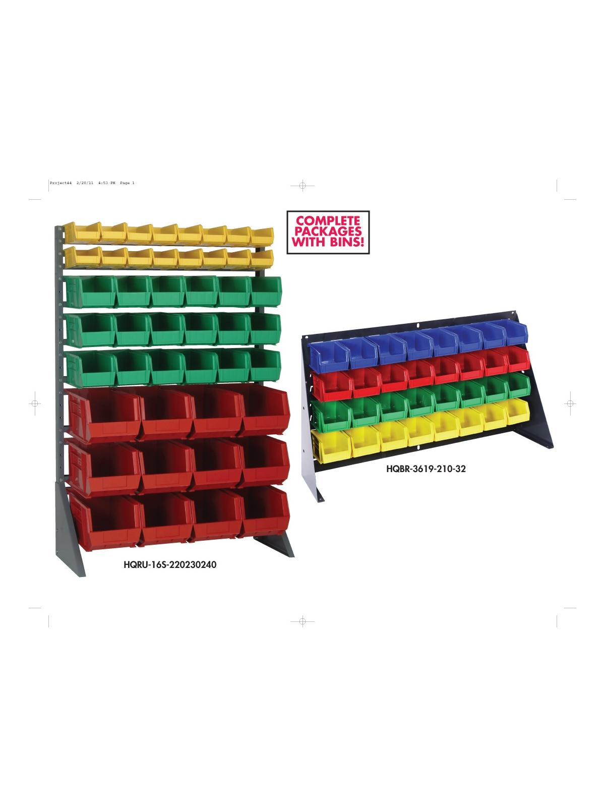 Measures 36" L x 25" W x 53" H, 500 lb. cap. Available in 3 different configurations. Mobilize double sided unit with the addition of HQRU-MOB. Bins are available in Blue, Yellow, Red, Green, Ivory and Black. One bin color per unit.