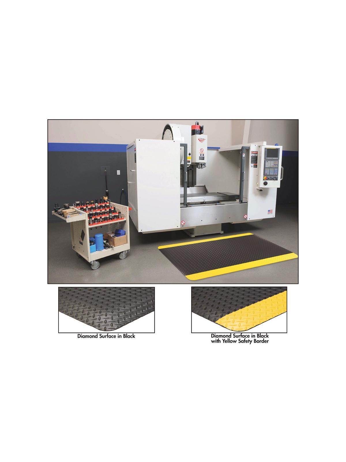 Rugged diamond surface provides great traction and wear characteristics. This anti-fatigue mat is great for any industrial work area needing comfort. Features beveled edges for added safety. Surface resists common fluids, and is non-flammable. Thick foam technology provides great resilience and enhanced worker comfort while standing. Three year warranty on wear and delamination. Three thicknesses to choose from: 9/16", 11/16" and 15/16". Available in Black or Black with Yellow safety border. Custom lengths up to 75'. FOB Shipping Point. See Related Items tab for Diamond Surface Anti-Fatigue Matting.