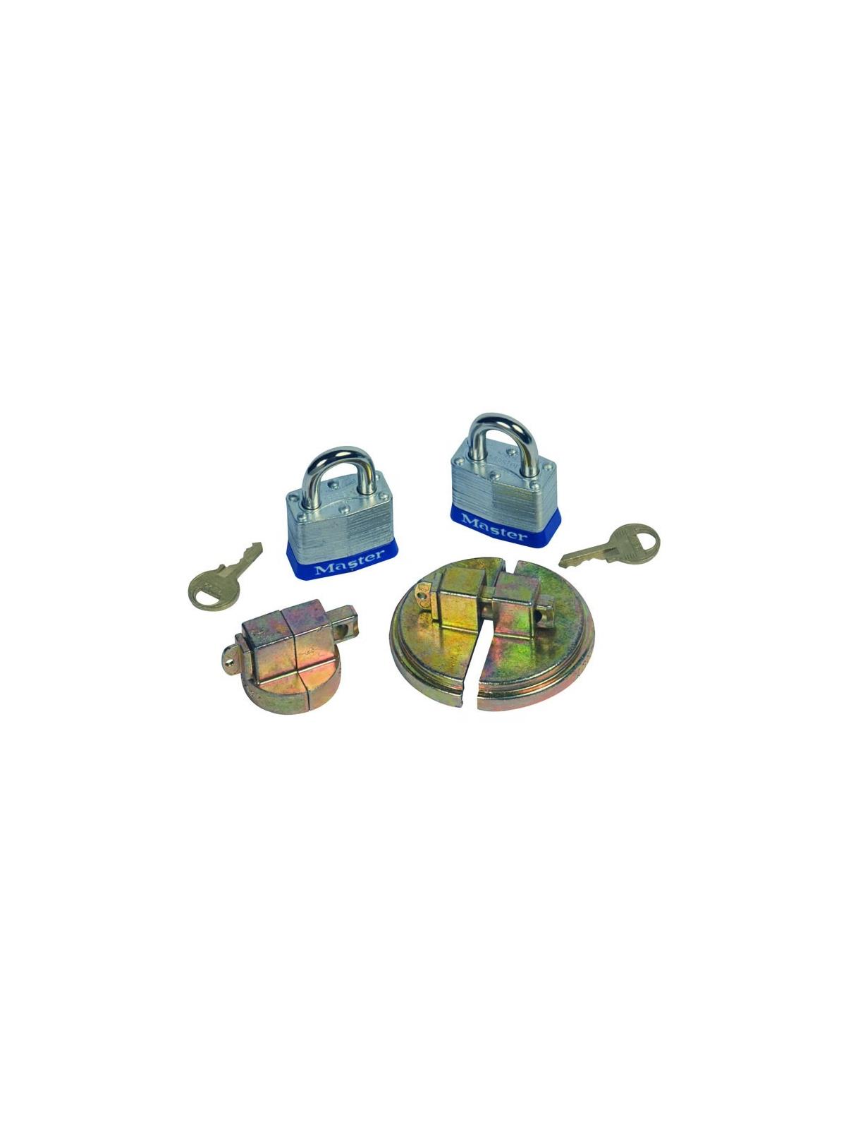 Drum locks are a cost effective solution to controlling storage concerns for all types of liquids, semi-liquids, and powders that come in standard drums. Made of corrosion resistant, non-sparking zinc die cast, the units easily install around the drum bung glange with no risk of cross threading. Sold as pairs, these drum locks fit the most popular styles of steel and plastic 55-gallon drums. The steel set includes two units; one to fit over the 2" NPT plug, and the other to fit over the 3/4" NPT plug. The plastic set includes two units which fit over both 2" plugs. FOB Shipping Point.