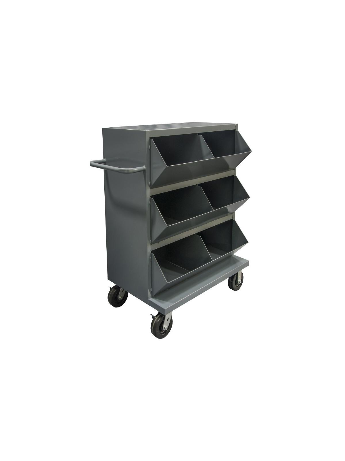Bin opening incorporates a slope design of 6" high. Choice of 3, 6, 12, or 19 open face bins. Has 6 x 2" bolt-on phenolic casters, 2 locking swivel and 2 rigid. Sturdy, tubular push handle. Top shelf is 49-1/4" above the floor. Shelf clearance is 13-3/8". Ships fully assembled, ready to use. FOB Shipping Point.