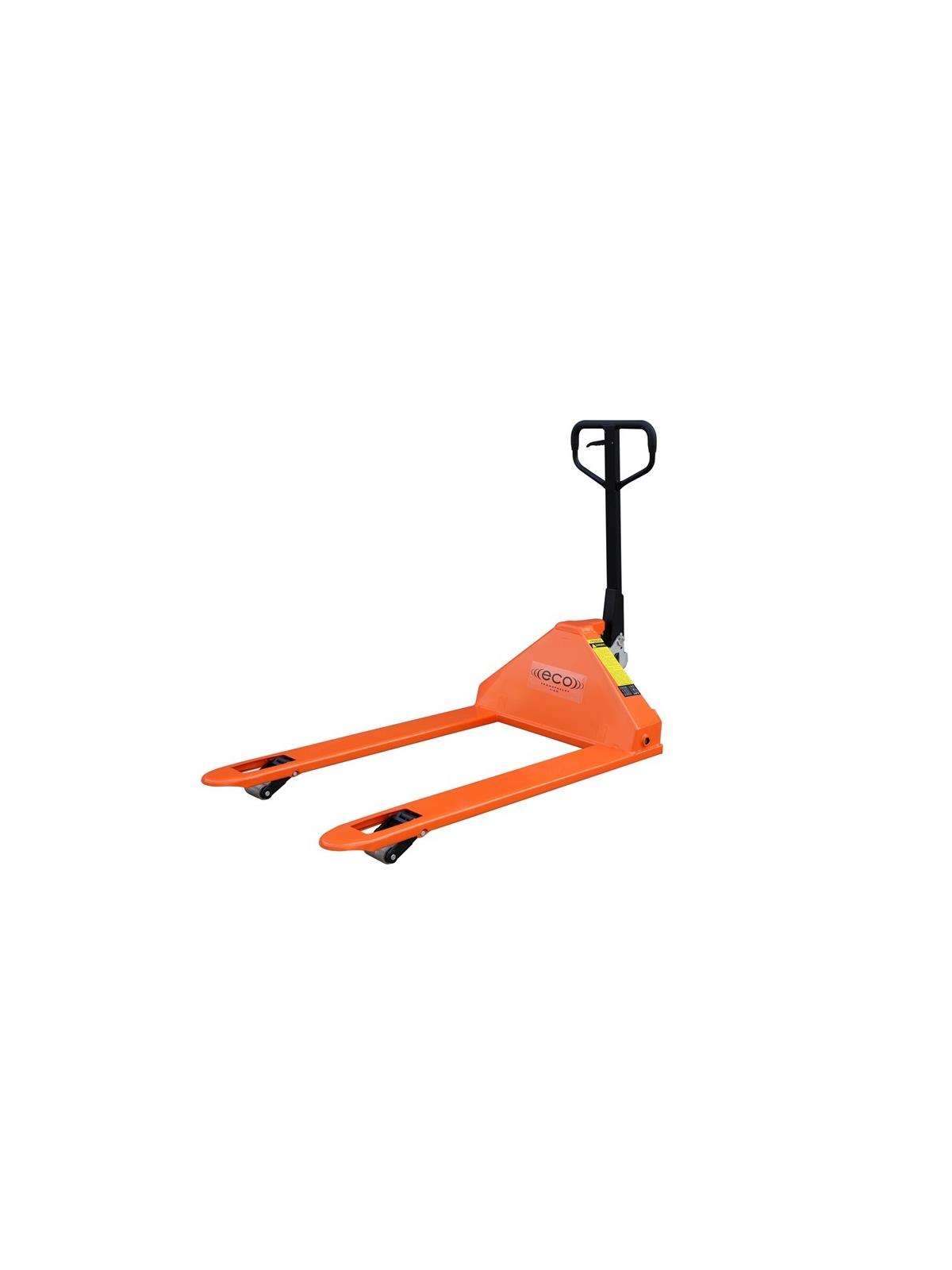 Designed for rugged, constant, heavy duty performance. Easy to use and maneuverable trucks feature polyurethane wheels and steel rollers, adjustable push rods, robotic welds, quality bearings throughout, grease fittings and bushings at all pivot points. Includes entry/exit rollers and an overload bypass system. Only 10 strokes to maximum lift. The H1203248 Pallet Truck is designed for 4-way pallets. FOB Shipping Point. 25% Steel surcharge may be added. See Related Items tab for Eco I-55 Standard & Custom Fork Size Trucks.