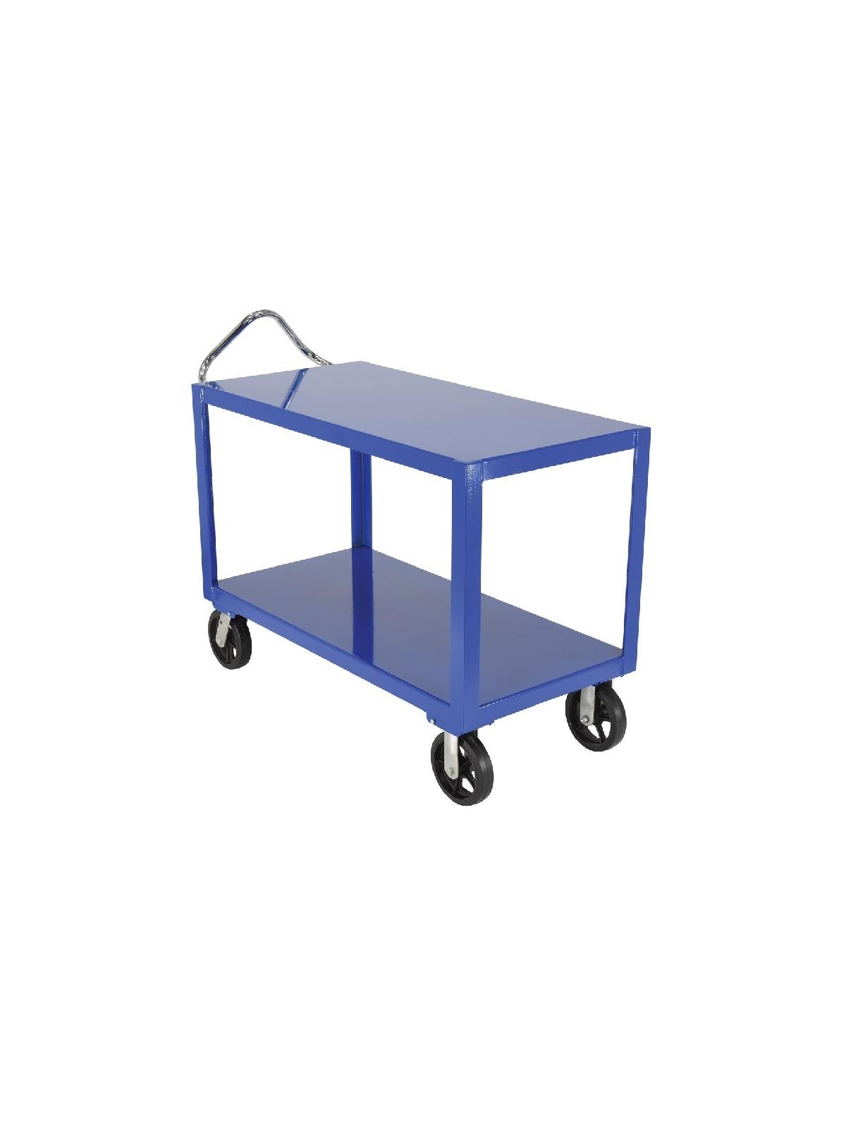 Constructed of heavy-duty steel to handle uniform loads up to 4,000 pounds. The patented ergonomic handle decreases fatigue by allowing the operator to easily maneuver the cart. Handle can be inverted for individual height comfort. Rolls on 8" x 2" casters, two (2) rigid and two (2) swivel with roller bearings. Many caster styles to choose from. Additional sizes available.  FOB Shipping Point.