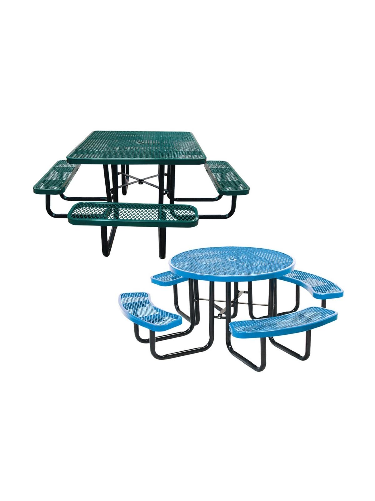 Our round and square 46" tables have weatherproof thermoplastic coating to provide years of attractive usage. Black powder coated galvanized steel 2" tubular understructure. Choose from 18 colors - please specify in comments when ordering. ADA tables available. FOB Shipping Point.