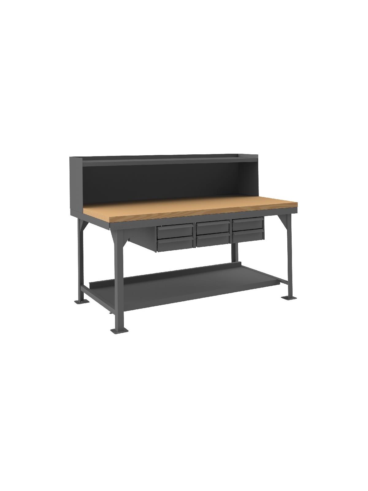 Products with top shelf risers used as shelf and back splash. See Related Items tab for Drawer for Durham Work Benches.