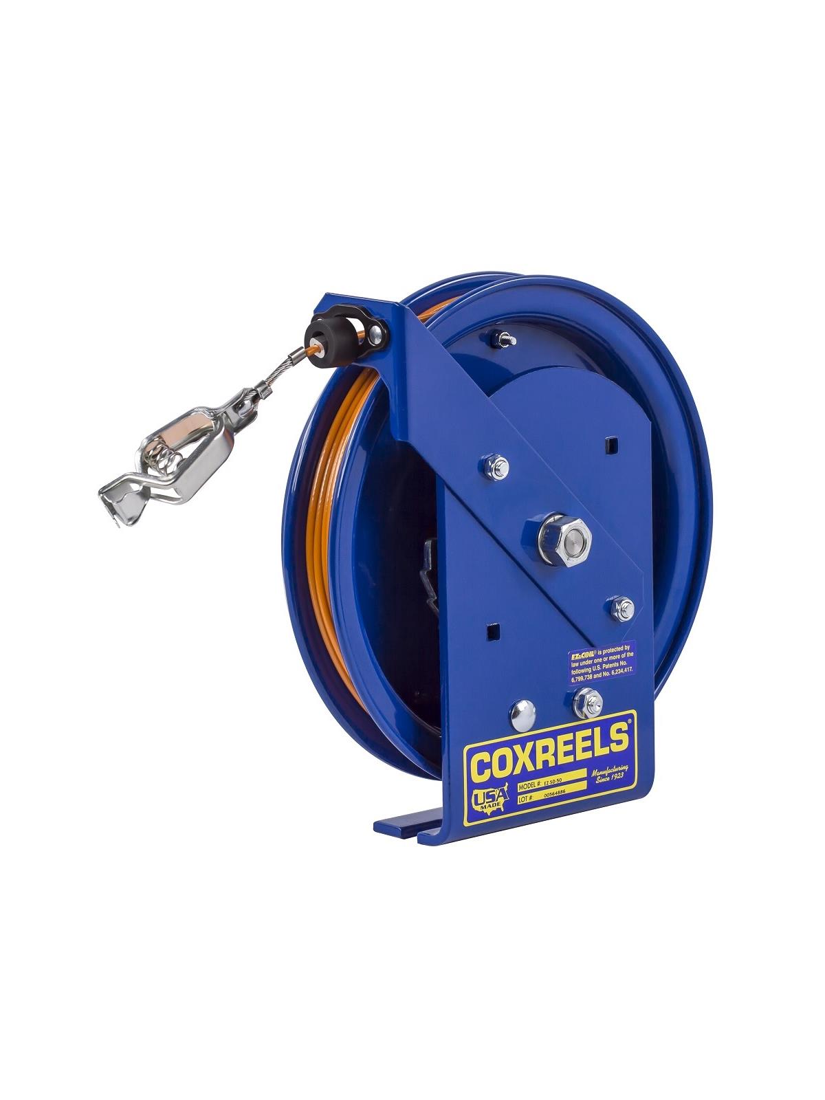 Controlled retraction reduces workplace accidents. Requires no electricity. Auto-rewind for fast easy pay out and take up. High quality heavy-duty steel construction. Non-sparking ratchet locks cable at desired length. 50 amp "jaw style" grounding cable. Includes 3/32" galvanized steel cable with 3/16" orange vinyl cover. Multi-position arm guide adjusts for wall, ceiling or floor mounting. Powder coated for greater durability. FOB Shipping Point. Surcharge may apply. USA Made. 2 Year Manufacturer's Limited Warranty.