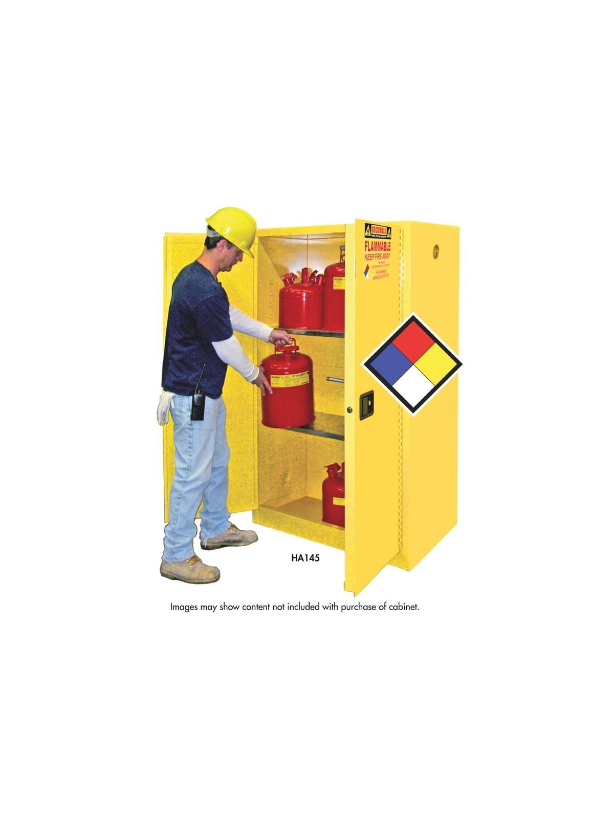 Keep flammable liquids close to the work area in a safe and organized way. Features 18 ga. all welded steel with double wall construction. Flush mounted locking handle and 3-point self-latching doors provide extra safety. Galvanized steel shelving is adjustable on 5-1/4" increments. All cabinets comply with current OSHA regulations and are designed in accordance with the standards of NFPA Code 30. All models are FM approved. FOB Shipping Point.