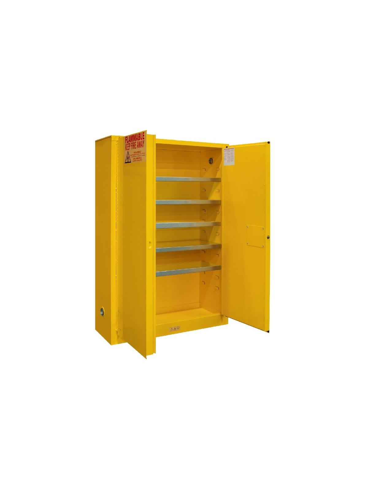 Flammable Storage Cabinets are required by OSHA and UFC in commercial and industrial facilities where flammable liquids are used and stored. Cabinets feature recessed lockable paddle latch and 3 point locking systems which greatly improves security. Bunged air vents on each side of the cabinet allows for greater ventilation. Constructed of all welded Heavy Duty Steel. 2" wide louvers support shelves. Units safely contain hazardous chemicals, reducing the risk of fire. FOB Shipping Point. Steel surcharges may apply.