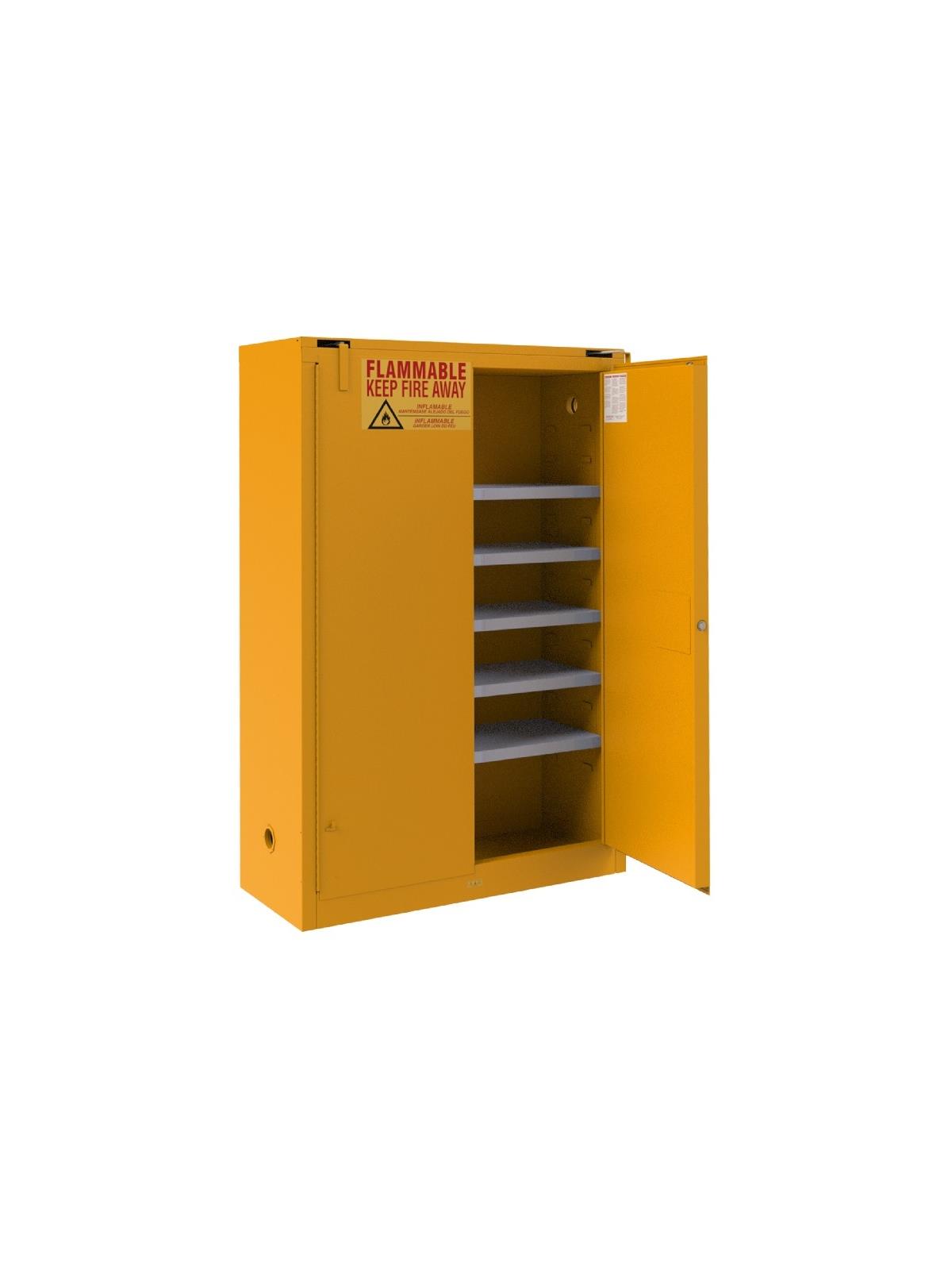 Flammable Storage Cabinets are required by OSHA and UFC in commercial and industrial facilities where flammable liquids are used and stored. Cabinets feature recessed lockable paddle latch and 3 point locking systems which greatly improves security. Bunged air vents on each side of the cabinet allows for greater ventilation. Constructed of all welded Heavy Duty Steel.
