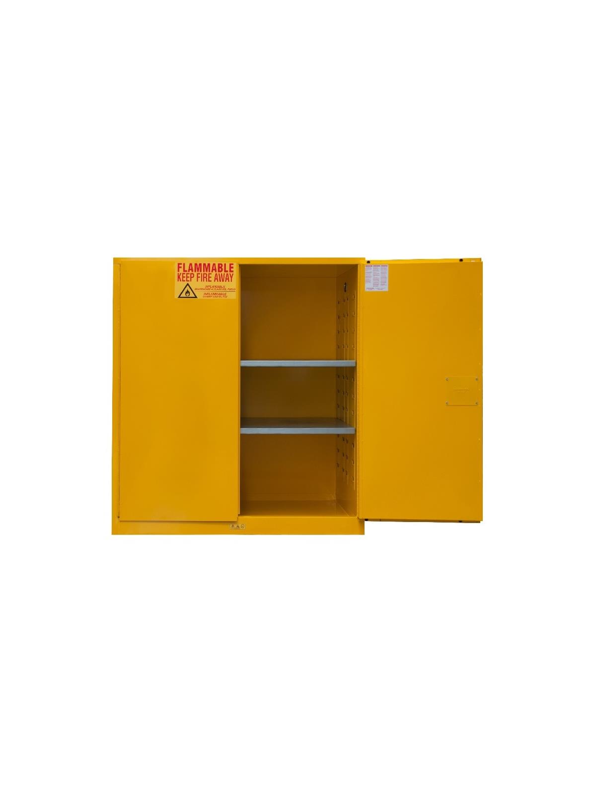 Flammable Storage Cabinets are required by OSHA and UFC in commercial and industrial facilities where flammable liquids are used and stored. Cabinets feature recessed lockable paddle latch and 3 point locking systems which greatly improves security. Bunged air vents on each side of the cabinet allows for greater ventilation. Constructed of all welded Heavy Duty Steel.