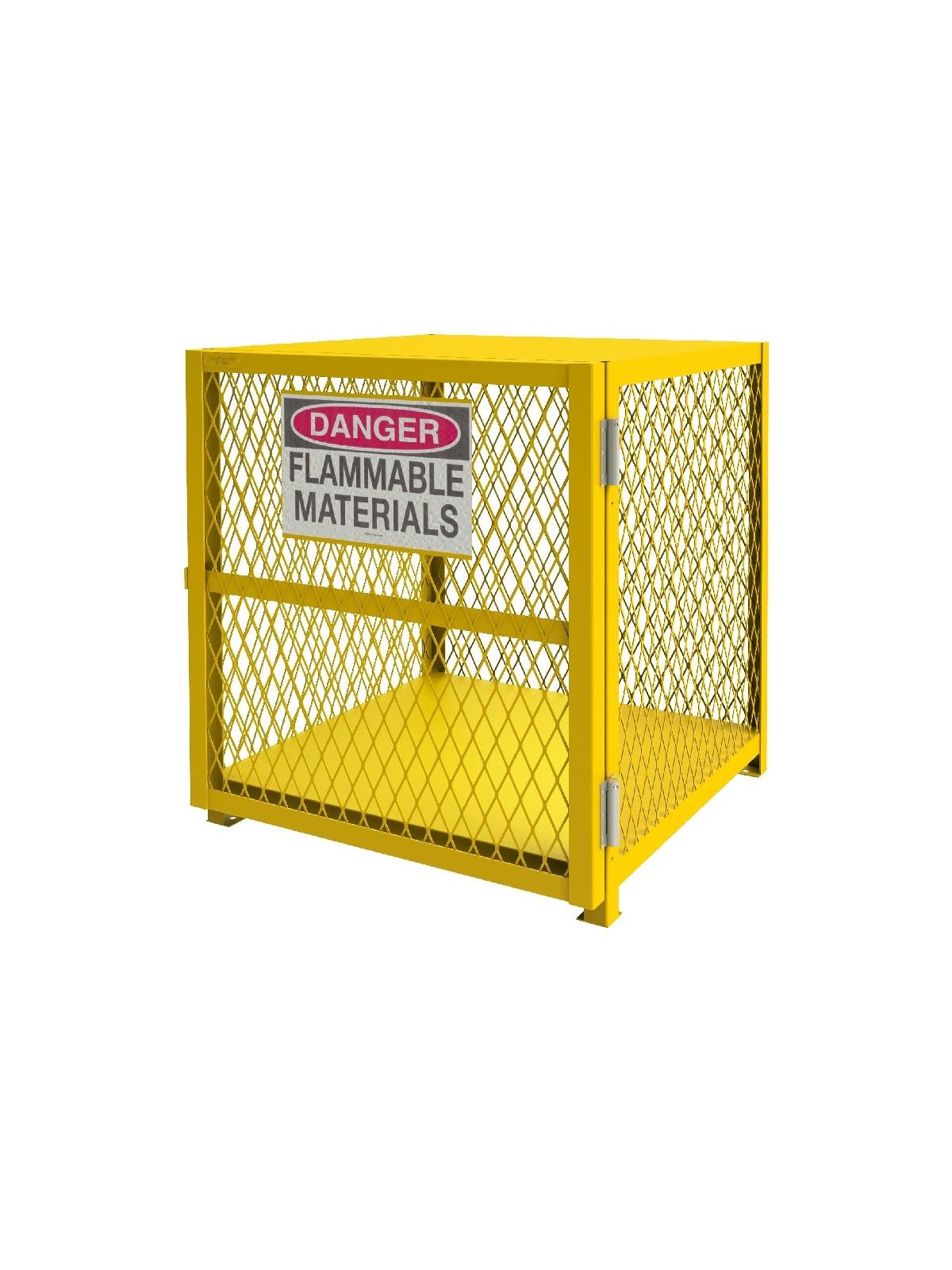 Lockable cabinets store cylinders of fuel, LP gases and other flammable materials on easy-to-access cylinder cradles. "DANGER FLAMMABLE MATERIALS" signs on each door. Magnetic catch keeps doors safely shut when not locked. Heavy-duty butt hinges keep doors from sagging. Includes padlock hasp to secure contents - padlock not furnished. Made of sturdy 1-1/2" x 1/8" angle iron frame. Pre-drilled holes for lagging to floor. Durable, rust and acid resistant safety Yellow powder coat finish. When used properly, units are in full compliance with OSHA and NFPA standards. FOB Shipping Point.