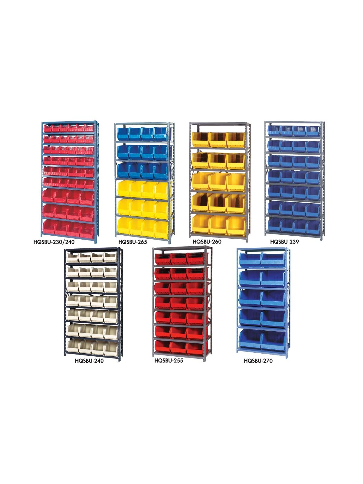 Sold complete with shelving and bins. 350 lb. capacity per shelf. Bins available in Yellow, Blue, Red, Green, Ivory and Black. FOB Shipping Point.