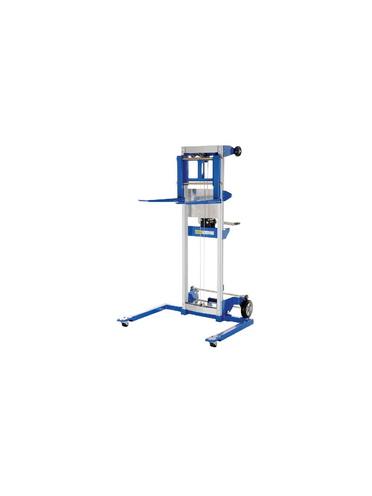 Operated by a hand-crank winch that features a reversible handle and a hold-down device for securing the carriage during transport. Forks can be inverted to provide 2 different heights. Rugged thick steel forks are 4"W x 1-3/4" thick and forks measure 20-1/2"W x 22"L overall. Truck is made of durable steel-and-aluminum. Two 8" non-marking rear wheels, two 2" front swivel casters. Counter balanced design has poly-on-poly wheels, (2) 5" rear swivel wheels, (2) 4" front wheels. Models ending with 'HP' and 'EHP' suffixes have extended height capabilities. These units have a 2 stage mast system and a telescoping inner mast frame, giving the user the ability to extend the forks above the height of the first mast. FOB Shipping Point.