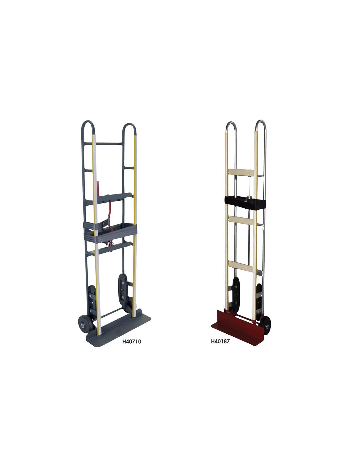These tough trucks offer maximum performance. Steel frame construction and puncture proof tires make these trucks durable and long-lasting. Also available in Aluminum, order H40187. Equipped with Belted Stair Climbers for easy rolling up and down stairs and over curbs, V-belts and nylon belt with Easy Lock Tightener to ensure the success of your material handling projects. Includes a vertical pad to protect the load. 60" high with a 4-1/2" x 24" toe plate. FOB Shipping Point.