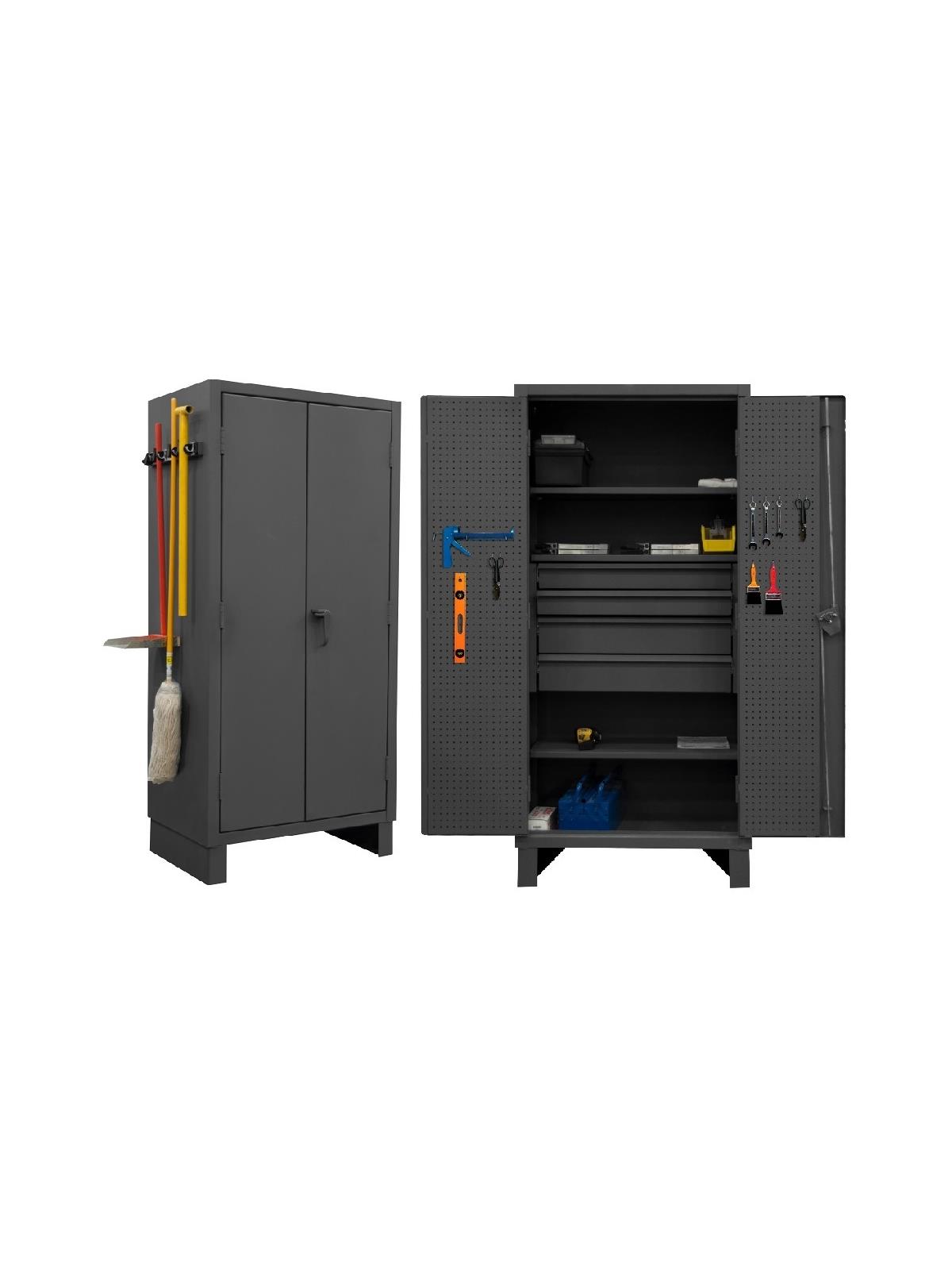 3-point locking system with pad-lockable cast steel locking handle (pad-lock not included). Full height flush doors with 7 gauge leaf hinges to prevent sagging. Drawers glide smoothly on bearing slides and have a 400 lb. capacity each. Shelves bolt into place easily using fasteners provided and adjust on 2-1/4" centers. 3 shelves 33 x 15-7/8" (2) adjustable and (1) fixed. Shelf Capacity; 1,750 lbs. per shelf. 4 drawers (2) 30-11/16W. x 14-1/16D. x 4"H and (2) 30-11/16W. x 14-1/16D. x 6"H. Utility storage hanger is included and comes installed. Doors open at 180° for full access to product. 16 gauge steel pegboard are welded to both doors. Pegboard holes are punched on 1" centers and accommodate standard peg hooks. 6"H base/legs provide access for forklifts; pre-punched holes allow for lagging to the floor. Durable, gray, textured powder coat finish. FOB Shipping Point.