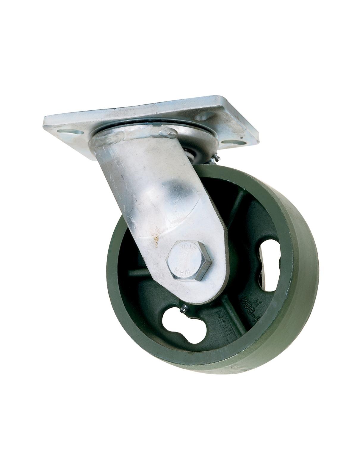Top plate is 5/16" cold forged. Top plate measures 4-3/4" x 6-5/8", bolt hole is 2-7/16" x 4-15/16", slotted to 3-3/8" x 5-1/4". Features precise double ball bearings. 3/4" Kingpin. Roller bearing. Zinc plated. FOB Shipping Point. Steel surcharge may apply. Wheel Description PAYRON - Cast iron steel. BRONCO - Gray rubber, Alum center. PAYTHANE - Red 95 Poly, metal center. PLEXITE - Black phenolic.