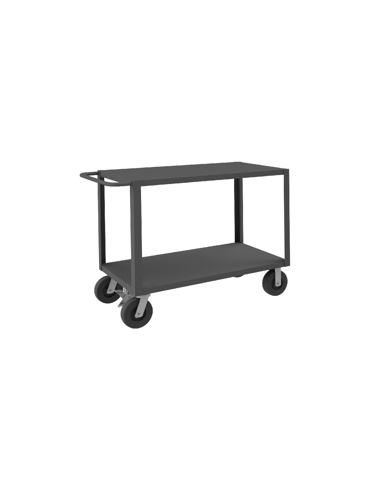 Heavy Duty Portable Tables have a 2" x 3/16" angle iron frame for added strength. Shelves are reinforced and have lips down. (2) swivel and (2) rigid bolt-on casters. Sturdy tubular push handle for easy maneuverability. 4,000 lbs. capacity unit has welded 14 gauge steel shelves with channel formed sides. 5,000 lbs. capacity unit has welded 12 gauge steel shelves. FOB Shipping Point.