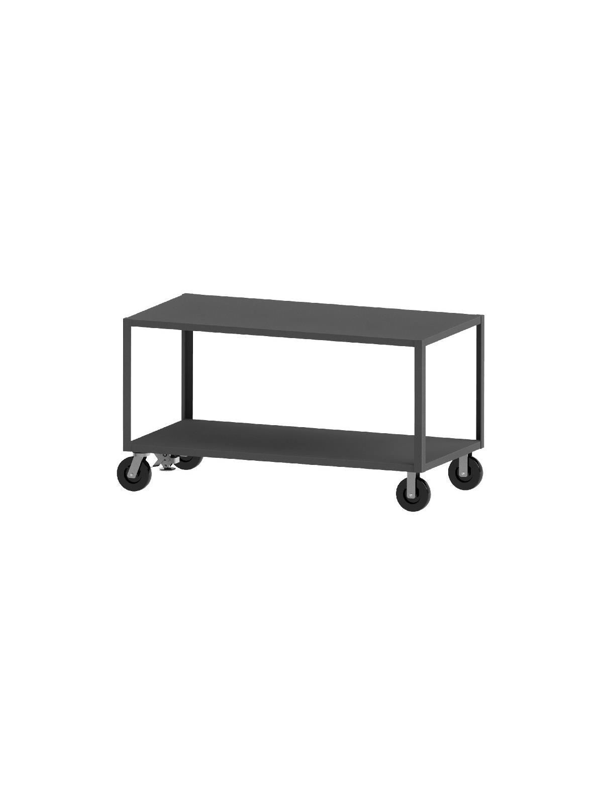 Heavy Duty Portable Tables have a 2" x 3/16" angle iron frame for added strength. Shelves are reinforced and have lips down. (2) swivel and (2) rigid bolt-on casters. Sturdy tubular push handle for easy maneuverability. 4,000 lbs. capacity unit has welded 14 gauge steel shelves with channel formed sides. 5,000 lbs. capacity unit has welded 12 gauge steel shelves. FOB Shipping Point. Steel surcharges may apply.