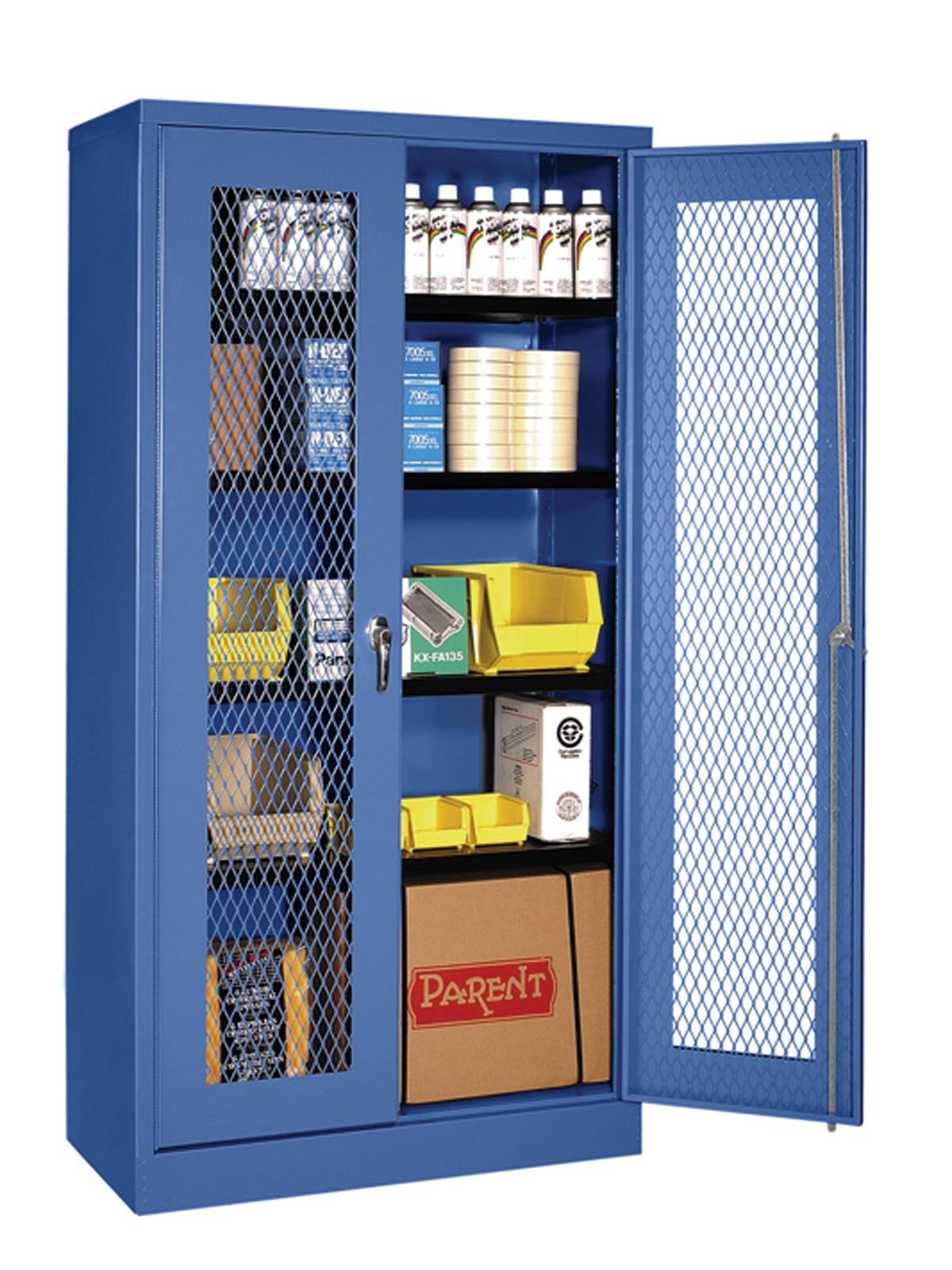 Features expanded metal door fronts for quick content identification and air circulation. Doors are 16 ga. with full height piano hinge. Shelves are 18 ga. with 400 lb. capacity each - adjustable on 2" centers. 3 point locking device with plated locking bars. Includes 2 handles with keys - 1 locking, 1 fixed. Durable Light Gray and Blue powder coat finish. FOB Shipping Point. Steel surcharge may apply.