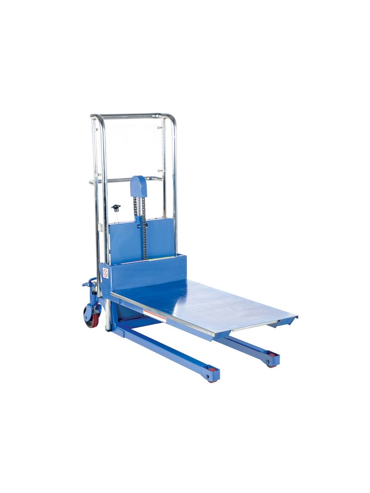Economical and attractive. Features removable chrome platform for operations requiring forks. Manual hydraulic pump mechanism yields 3/4" of platform travel per stroke. Non-slip chain is used for accurate positioning. Units roll easily on 2 rigid, 2 swivel polyurethane casters and includes a foot operated brake for extra safety. All welded steel construction with chrome platform and uprights. Forks measure 4-3/8"W. x 2-1/2"H. -- fork length is same as platform length. Not for use with pallets. FOB Shipping Point.