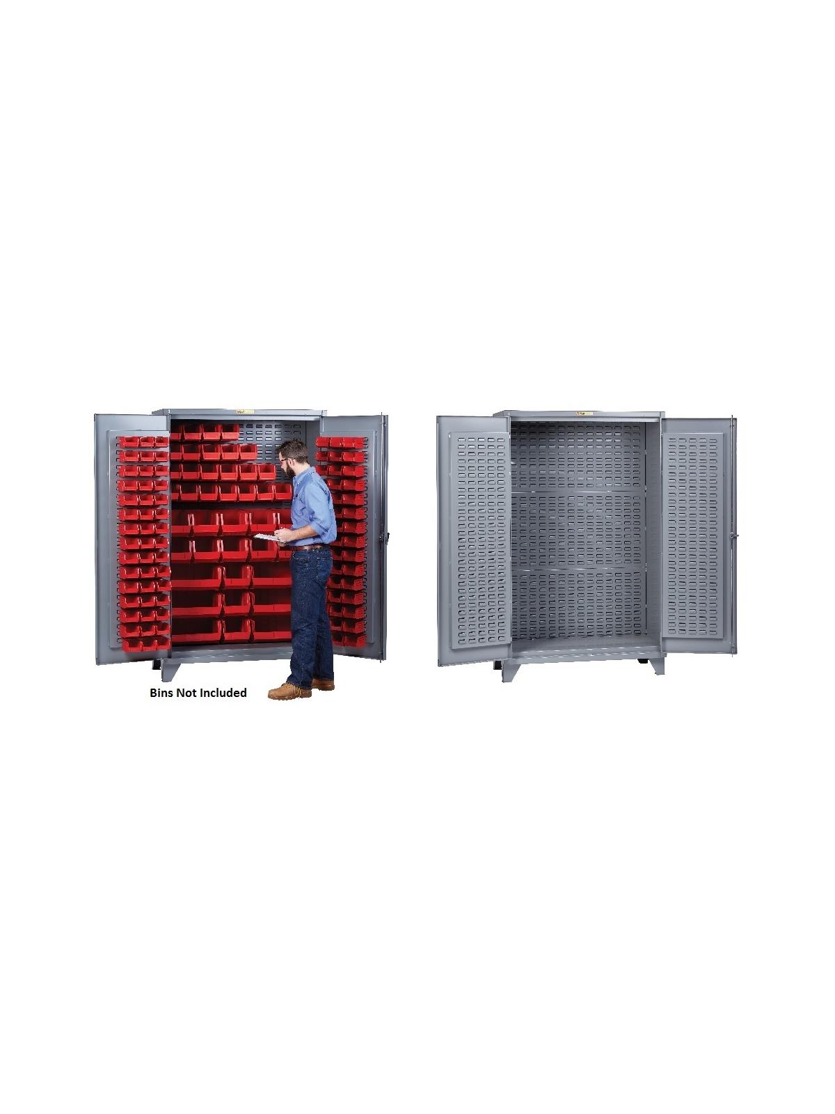 All-welded, heavy-duty 12 gauge steel cabinet features built-in 16 gauge louvered panels on back and doors for your hanging bins. Doors swing open 180° to allow complete access. Keyed handle with 3-point locking system secures doors at top, center, and bottom. Durable powder coated finish. Overall height 78" with 5-1/2" clearance under unit to permit movement by pallet truck. FOB Shipping Point.
