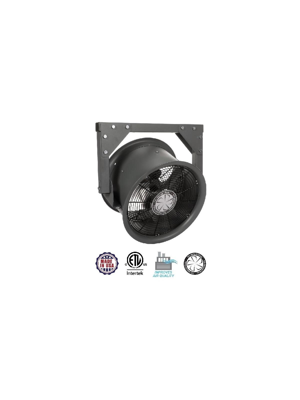 Housing designed for all types of air circulating applications to provide directional - high velocity air flow. Built-in rotating design allows the supplied mounting bracket to pivot 120 degrees in (9) adjustment setting at 15 degree variations. Front and rear spiral wound grills are OSHA approved and have a black coated finish. All units are shipped fully assembled and ready for hard-wired connections. TEAO motor has a Class B rating, with automatic thermal protection and ball bearing design for harsh environments; rated up to 115 degrees Fahrenheit maximum ambient temperature. Single and three phase options available in 120, 208/240, 277 and 480-volt. Mounting brackets sold separately. FOB Shipping Point. See Related Items tab for High Velocity Air Circulators - Mounting Brackets.
