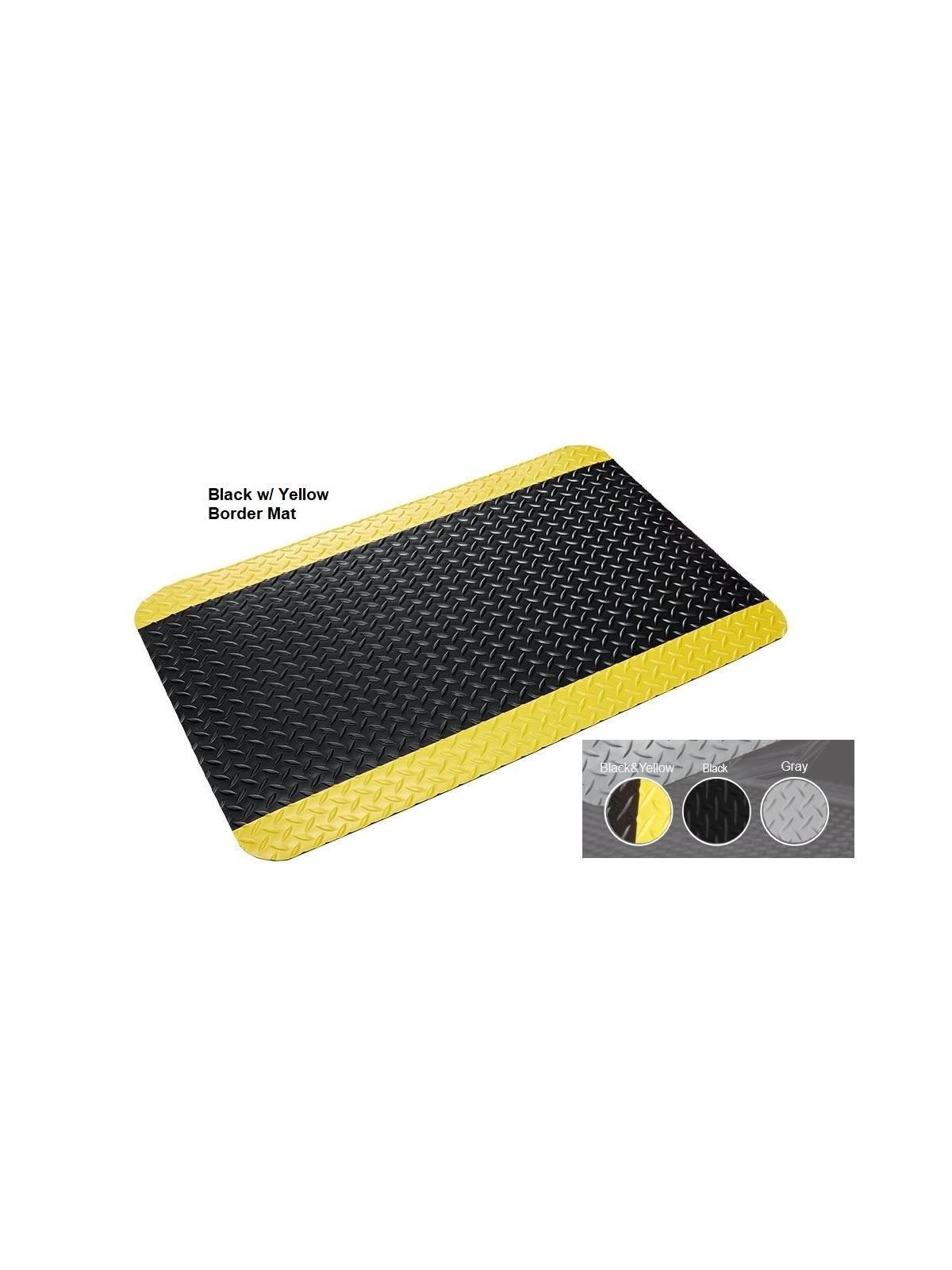 Industrial deck plate is the most widely used product in the market. Deck plate top surface is fused to an industrial grade PVC foam backing to offer comfort and relief. Exclusive Fusion technology bonds the layers without the use of glue or adhesives which reduces the possibility of product separation. Durable slip-resistant surface tolerates cart traffic. Contains up to 50% recycled material in top surface. Offered in 9/16" and 7/8" thickness and customization is available in any size or shape. FOB Shipping Point. Available in Black deck plate (BK), Gray (GY), or Black with Yellow Borders (YB).