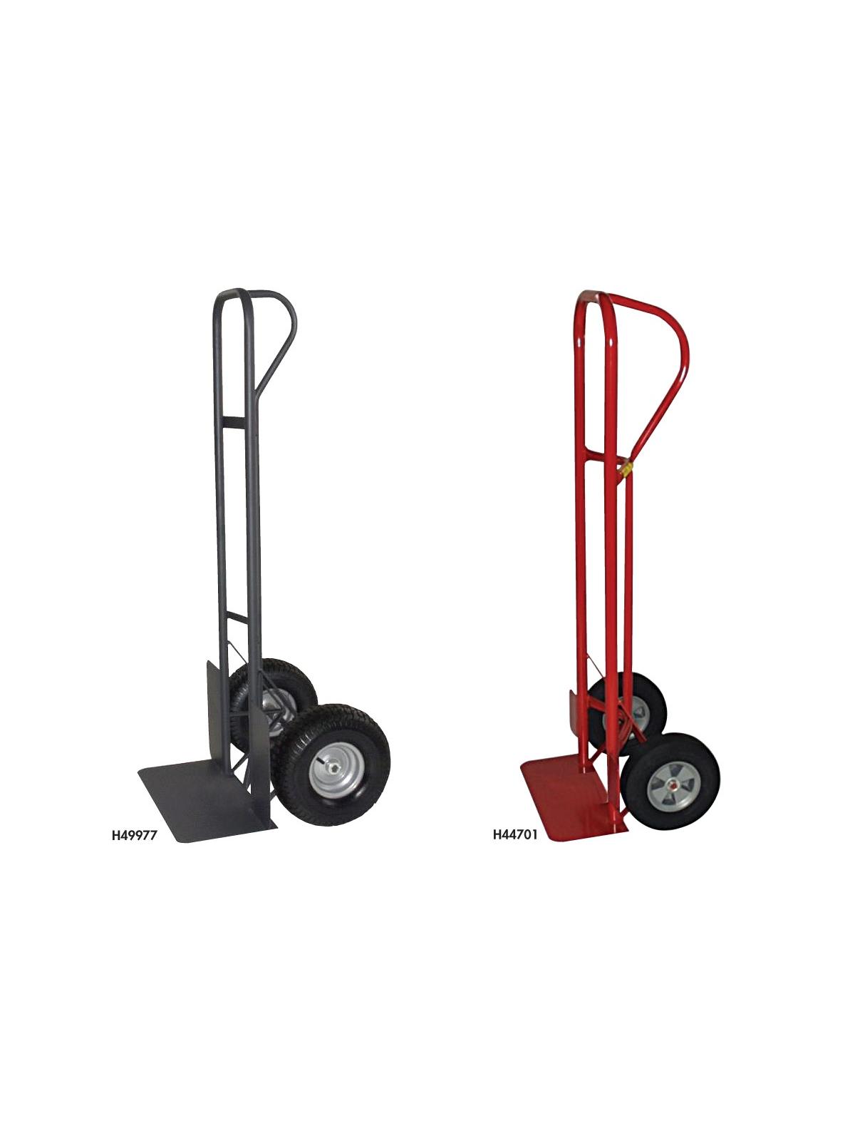 All steel construction with wheel guards and ergonomic handle design. P-shaped handle provides maximum mobility and minimizes operator stress. Pneumatic tires are designed to carry heavy loads over rough terrain while cushioning the load. Puncture proof tires can tackle most any job around the warehouse, shop or home. H49977 & H44701 have heavier duty 1-1/4" steel tubing. FOB Shipping Point.
