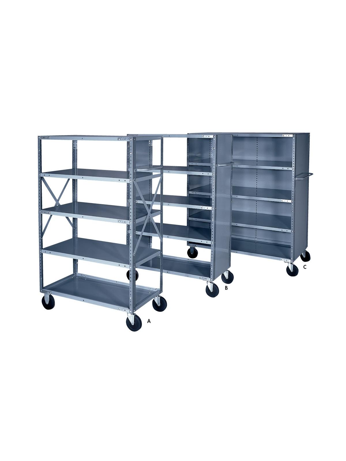 Exclusive ribbed formed base shelf increases carrying capacity. Heavy 13 ga. posts allow 1" shelf adjustment. Convenient push handle for fingertip control. Easy rolling on 5" solid rubber casters (2 swivel, 2 rigid). Available in open, closed ends or closed types. Gray finish. FOB Shipping Point.