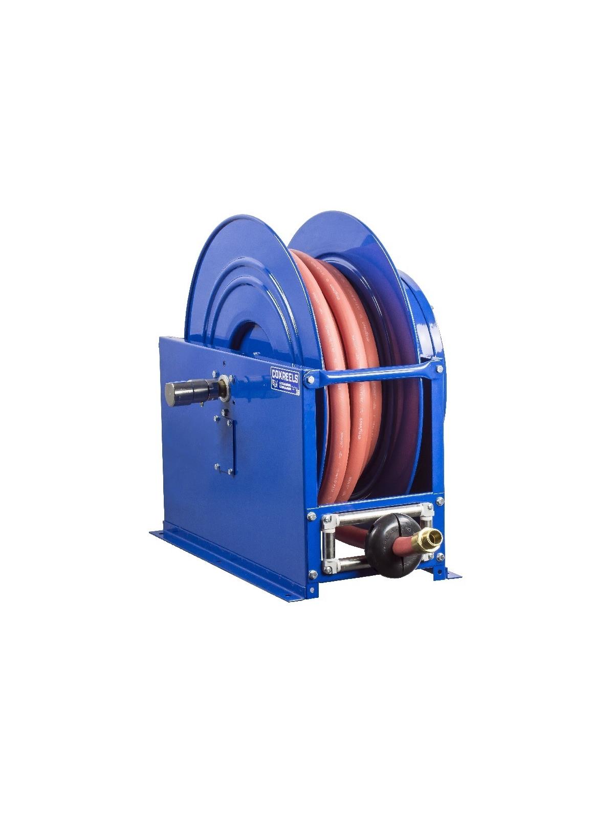 Fully enclosed spring rewind reel is designed to handle temperatures up to 225°F and pressures up to 300 PSI. Also features full flow swivel, six position locking mechanism and heavy duty frame and drum assembly for ease of operation and long life. Spring motor enclosed in safe replace cartridge. Hose not included. FOB Shipping Point. Surcharge may apply. USA Made. 2 Year Manufacturers Limited Warranty.