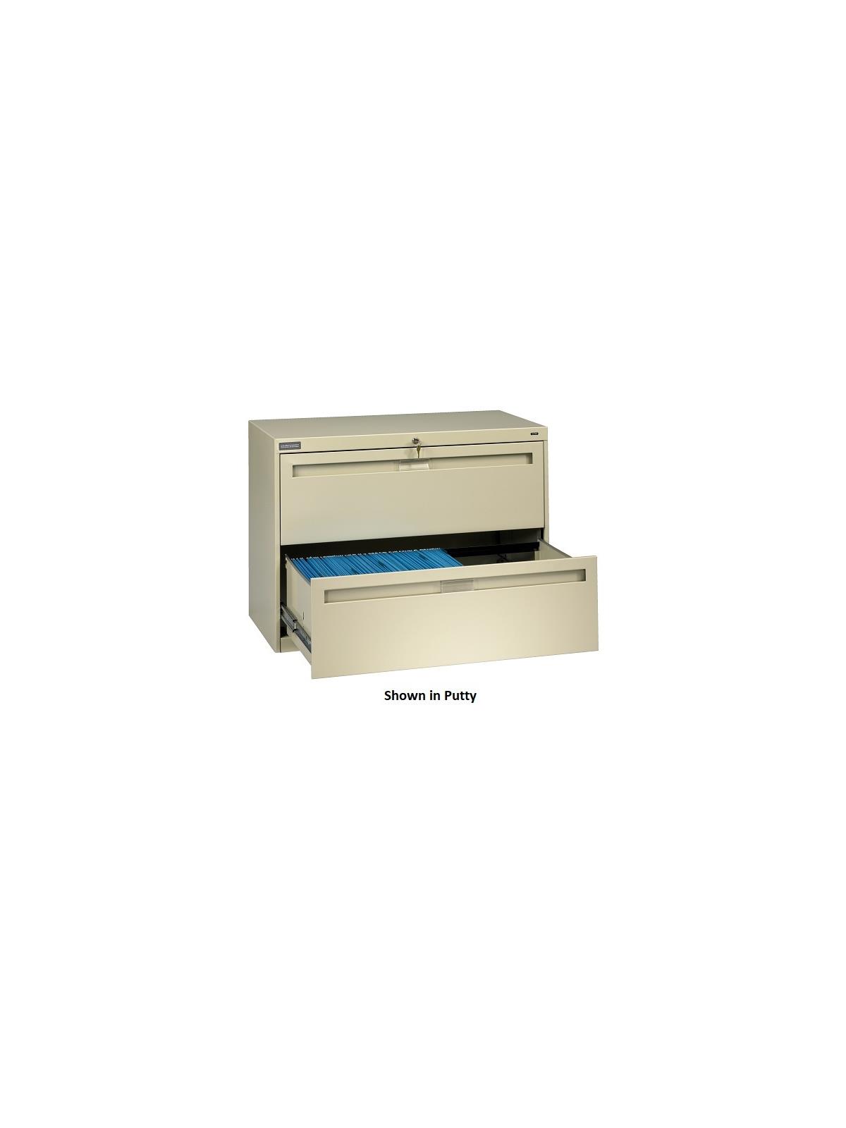 Drawers and doors have easy grip, full-width pulls with recessed label holders. Four leveling glides allow the unit to be leveled on uneven floors. To reduce risk of tipping, order two drawer lateral files with counterweights (suffix "W") for all applications except under a work surface in a workstation. Five and six-high units have retractable door(s) with roll-out drawer on top opening(s). Durable powder-coat paint finish.