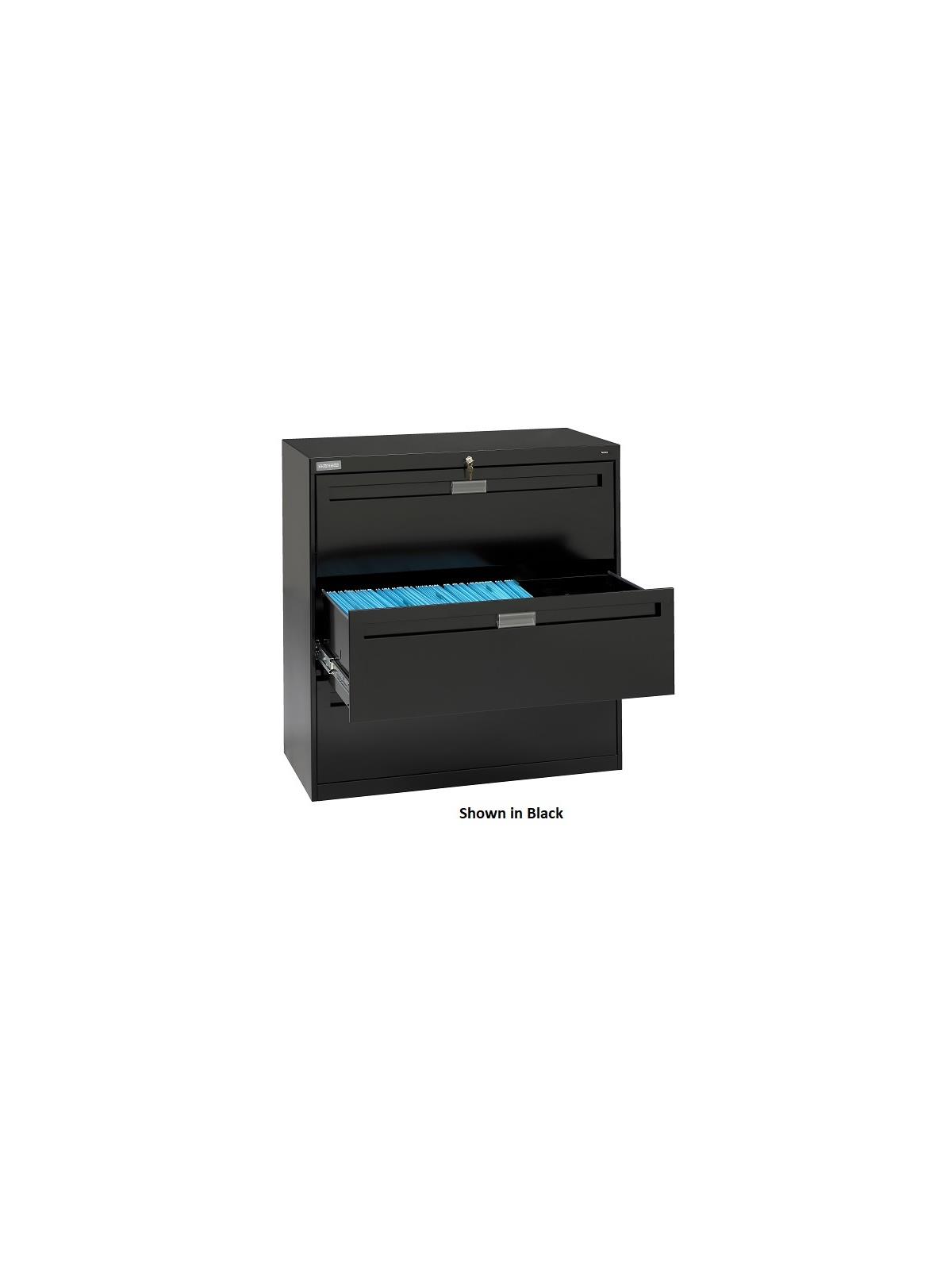 Drawers and doors have easy grip, full-width pulls with recessed label holders. Four leveling glides allow the unit to be leveled on uneven floors. To reduce risk of tipping, order two drawer lateral files with counterweights (suffix "W") for all applications except under a work surface in a workstation. Five and six-high units have retractable door(s) with roll-out drawer on top opening(s). Durable powder-coat paint finish.