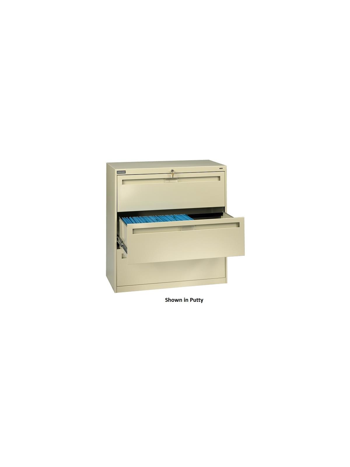 Drawers and doors have easy grip, full-width pulls with recessed label holders. Four leveling glides allow the unit to be leveled on uneven floors. To reduce risk of tipping, order two drawer lateral files with counterweights (suffix "W") for all applications except under a work surface in a workstation. Five and six-high units have retractable door(s) with roll-out drawer on top opening(s). Durable powder-coat paint finish.