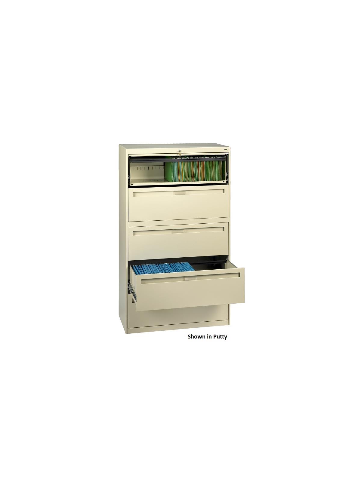Drawers and doors have easy grip, full-width pulls with recessed label holders. Four leveling glides allow the unit to be leveled on uneven floors. To reduce risk of tipping, order two drawer lateral files with counterweights (suffix "W") for all applications except under a work surface in a workstation. Five and six-high units have retractable door(s) with roll-out drawer on top opening(s). Durable powder-coat paint finish.