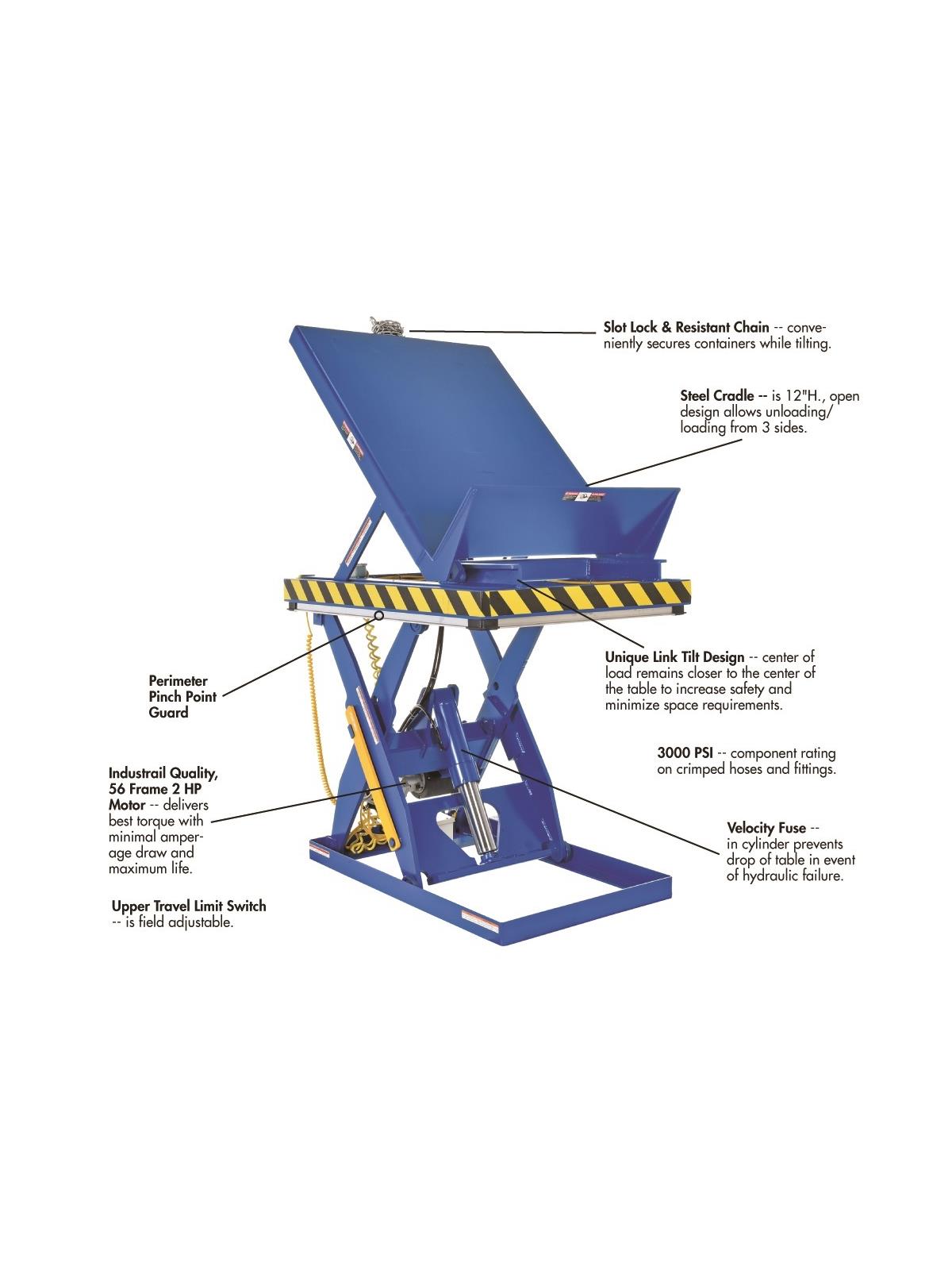 Features toe/pinch guard. 4 push-button hand pendant control on an 8' coil cord. Emergency stop if hose breaks. Fused 24V push button control. Lock-in place safety maintenance support. 45° maximum tilt, 36" vertical travel. FOB Shipping Point.