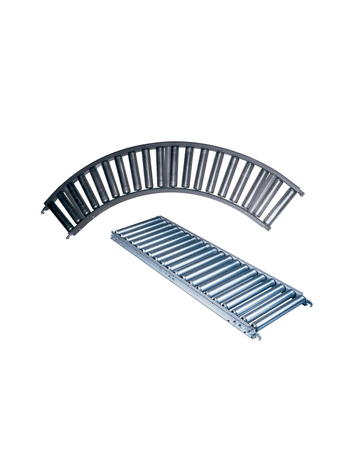 Rollers measure 1-3/8" diameter and are 18 gauge galvanized steel or 18 gauge aluminum, with flanged type bearings and spring loaded 1/4" wide axle. Aluminum conveyors have 2-1/2" x 1" x 1/8" aluminum channel frames, while steel ones have 2-1/2"x 1" x 12 gauge galvanized frames. Channel capacity for steel conveyors is 900 lbs. and for aluminum, 600 lbs. FOB Shipping Point. Surcharge may apply.