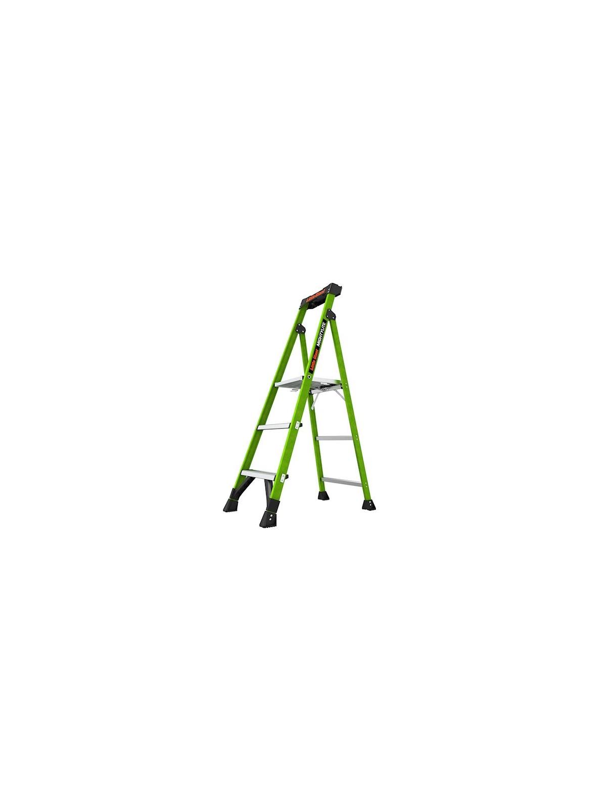 The Mightylite's patented-pending Ground Cue prevents injuries by signaling the user when it is safe to dismount the Ladder.  No-pinch platform design opens easily from a slim 4" storage profile and offers wide comfortable treads on each rung, with a spacious, comfortable standing deck.  Its innovative top cap allows you to keep all of your tools close at hand.  Designed to address the three leading types of stepladder injuries: painful body injuries from carrying heavy equipment, dangerous falls from standing on the top rung and ankle, knee and back injuries from missing the bottom rung. Available in both type IA (300 lbs.) and type IAA (375 lbs.) ratings. FOB Shipping Point.