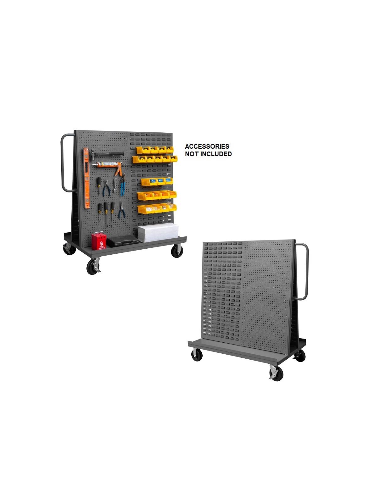 Versatile and mobile trucks are perfect for any environment. Frame is made from 1-1/2" angle iron with 16 gauge louvered panels and 16 gauge steel pegboard welded to opposite sides of the truck. Pegboard holes are punched on 1" centers and accommodate standard peg hooks (pegboard hooks sold separately). Deck is 12 gauge steel with reinforced channels underneath and sits 8" above the floor. 1-1/2" lip on deck prevents parts from falling off during transport. Heavy duty handle makes transport easy. Truck comes with 6 x 2" phenolic casters - 2 rigid and 2 swivel with side brakes. Available in Gray powder coat finish. Ships fully assembled. FOB Shipping Point. Steel surcharges may apply.