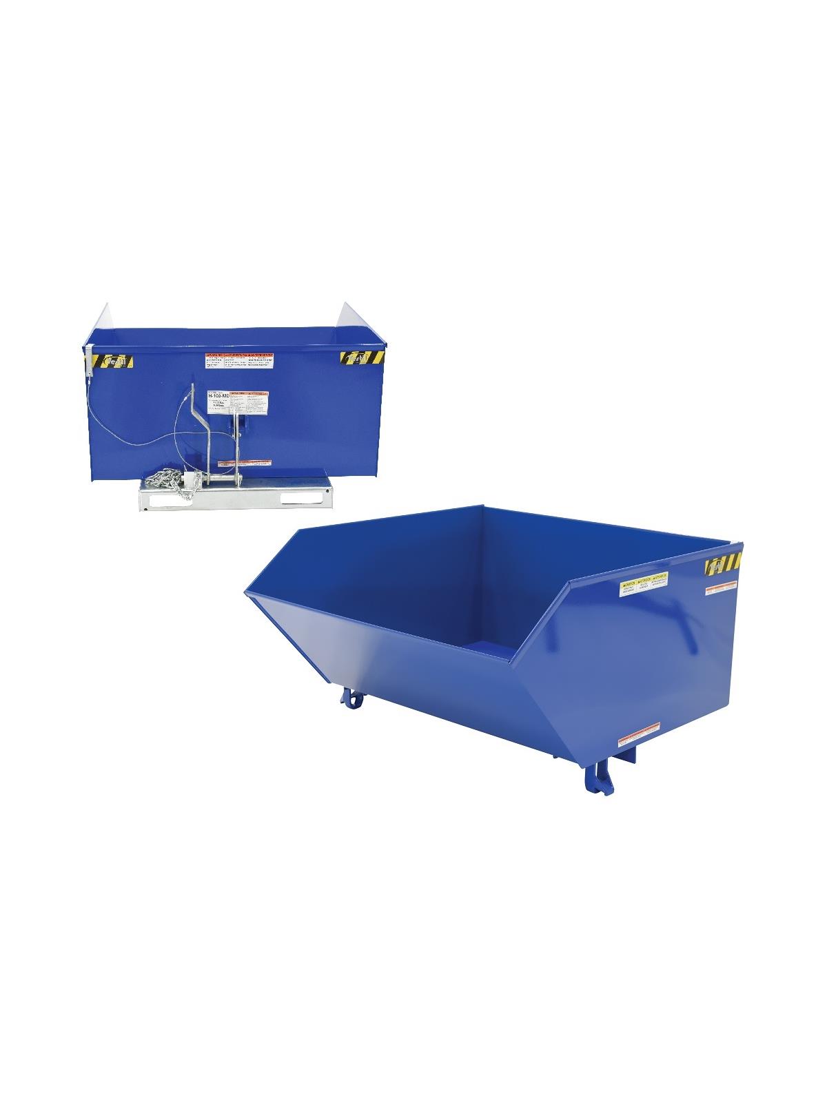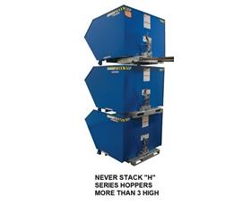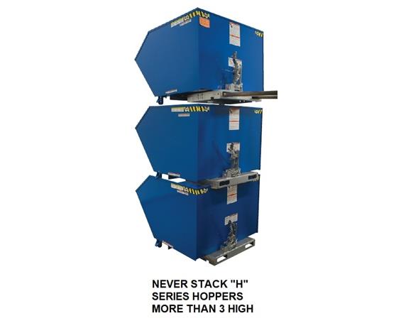 Units feature a full 90 degree dump angle with a cushioned rubber bumper stop. The low profile design is essential for convenient loading. Dumping with a fork truck is quick and simple. A cable is pulled from the seat of the fork truck to dump the hopper. The unit returns to an upright and locked position when lowered to the ground. The included safety restraint/chain must be securely attached to the lift truck without slack. 22" L usable fork pockets measure 7" W x 2"H. Formed base thickness is 1/4". Blue baked-in powder-coated toughness with a galvanized base. Other colors available-contact factory. Models H-25 may be stacked with H-50 models, while the H-100 can be stacked with the H-150 models. The H-200 hoppers can only be stacked with other H-200 series models. Must be attached to fork truck when dumping. FOB Shipping Point.
