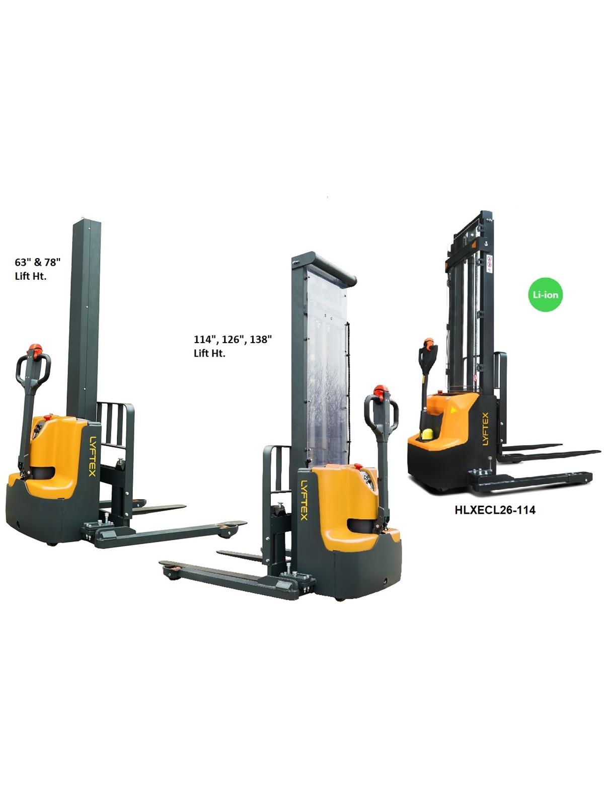The LYFTEX HLXECL series Walk-Behind Stacker is a great choice for medium-duty transportation and storing applications within a warehouse setting. This unit is equipped with adjustable straddle legs and forks which add more versatility and flexibility to the unit to accommodate all sorts of load from pallets, skids and other cargo. It also features a 4-wheeler design with sideways tiller for excellent maneuverability and stability. All wheels are made out of superior non-marking polyurethane and are constructed to withstand high impact and directional changes with great shock absorption capabilities allowing the operator to use it smoothly with excellent rollability and high speeds. The unit comes with a dual butterfly-style thumb controls with Curtis controller, and much more. It also features a robust ergonomic handle with an Emergency Stop button, raise/lower, and "belly-bump" buttons within immediate finger proximity. The HLXECL22 features a 2 x 12V/85Ah Lead Acid Battery with a 24V/10Ah 110V charger. The HLXECL26 has 24V/60Ah Lithium Battery with a 24V/25Ah 110V charger. FOB Shipping Point.
