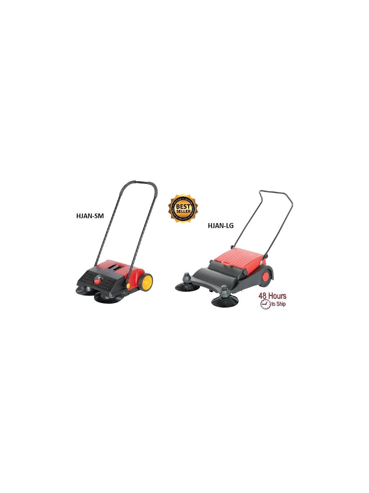 HJAN-LG is a deluxe brush sweeper. The two (2) 11' diameter brushes, one on each front corner, come with independent 1/2" height adjustment. The bottom center brushes also features 1/2" height adjustment. Those brushes measure 17-1/2" x 5-1/2". A folding handle for easy storage.