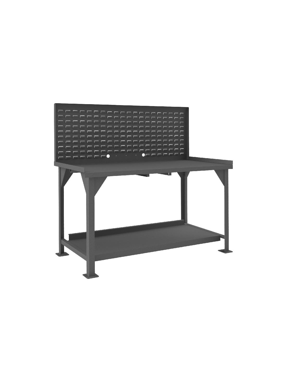 Workbench top is 12 gauge thick reinforced steel. Has angle iron stiffener under work surface and 2" x 2" x 1/4" angle iron legs. Mobile units (DWBM) include (4) 3" phenolic, locking swivel casters. Back and end stops. All units have provisions for optional drawer to be added. Work surfaces are 34" above the floor. All models include a 12 gauge steel lower shelf with 500 lbs. capacity. Foot pads with predrilled holes allow for lagging to the floor. FOB Shipping Point.