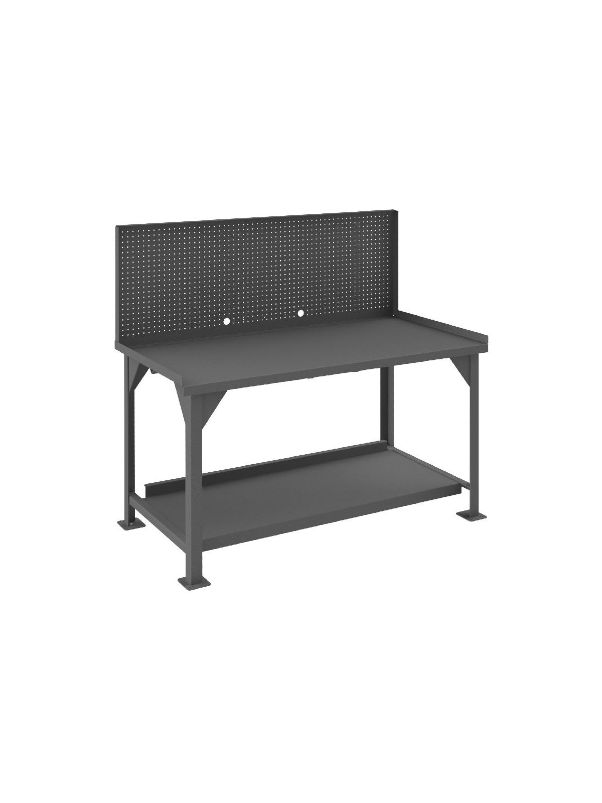 Workbench top is 12 gauge thick reinforced steel. Has angle iron stiffener under work surface and 2" x 2" x 1/4" angle iron legs. Mobile units (DWBM) include (4) 3" phenolic, locking swivel casters. Back and end stops. All units have provisions for optional drawer to be added. Work surfaces are 34" above the floor. All models include a 12 gauge steel lower shelf with 500 lbs. capacity. Foot pads with predrilled holes allow for lagging to the floor. FOB Shipping Point.