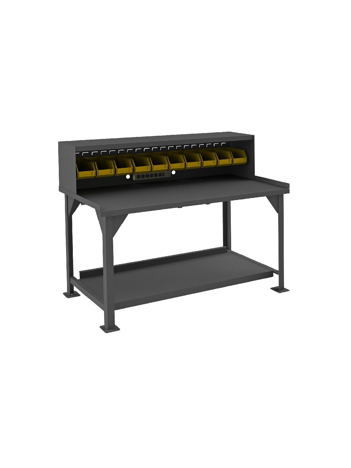 Workbench top is 12 gauge thick reinforced steel. Has angle iron stiffener under work surface and 2" x 2" x 1/4" angle iron legs. Mobile units (DWBM) include (4) 3" phenolic, locking swivel casters. Back and end stops. All units have provisions for optional drawer to be added. Work surfaces are 34" above the floor. All models include a 12 gauge steel lower shelf with 500 lbs. capacity. Foot pads with predrilled holes allow for lagging to the floor. FOB Shipping Point.