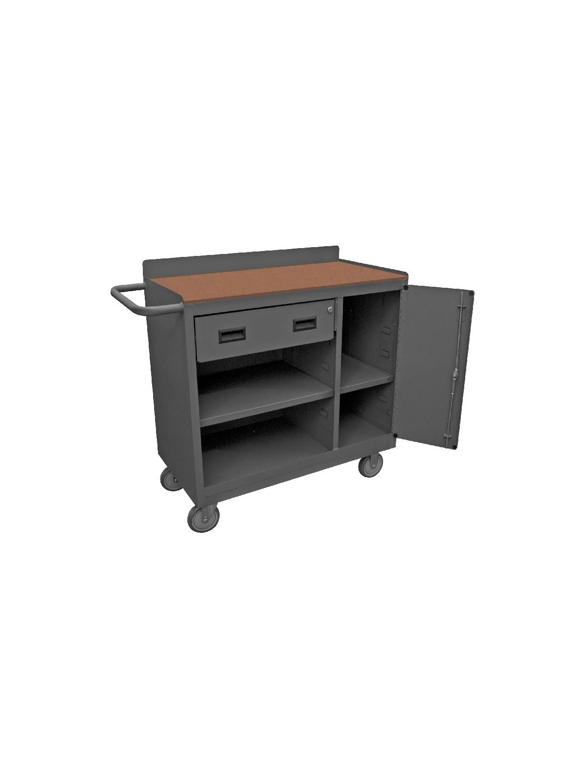 Unit features back and end stops on the work surface. Bolt-on 5 x 1-1/4" polyurethane casters, 2 swivel and 2 rigid with side brakes. Cabinet compartment comes equipped with one adjustable shelf and a keyed handle with 3 point locking system. Models with -TH in the part number include a work surface with 1/4" thick tempered hardboard. Drawers measure 20-7/16" W x 14-11/16" D x 5-7/8" H. Ships fully assembled and ready to use. FOB Shipping Point.